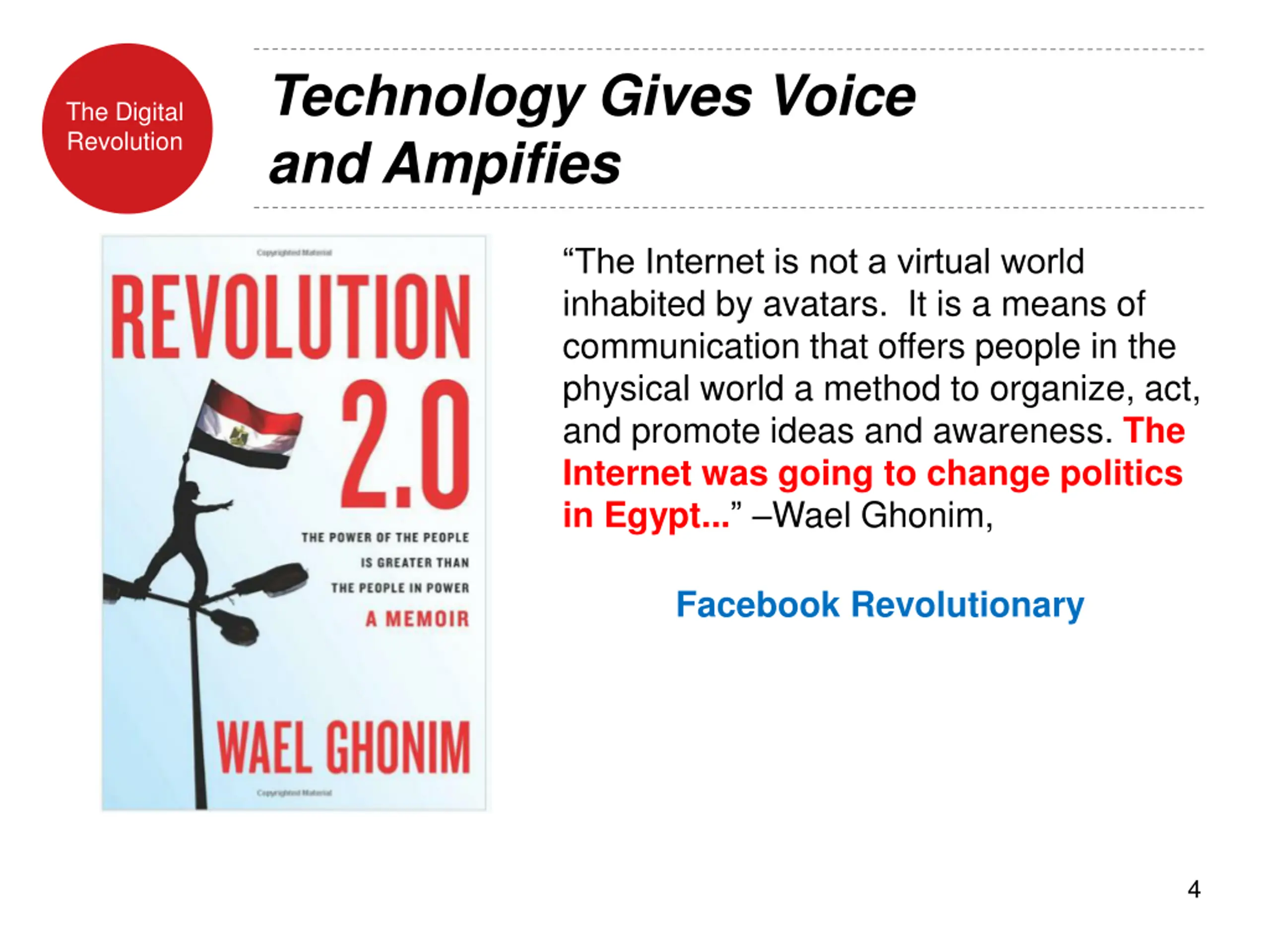 Technology Gives Voice and Ampifies Two Kinds Of Two Kinds Of Social Media The Digital Revolution The Internet is not a virtual world inhabited by avatars. It is a means of communication that offers people in the physical world a method to organize, act, and promote ideas and awareness. The Internet was going to change politics in Egypt... Wael Ghonim, Facebook Revolutionary 4