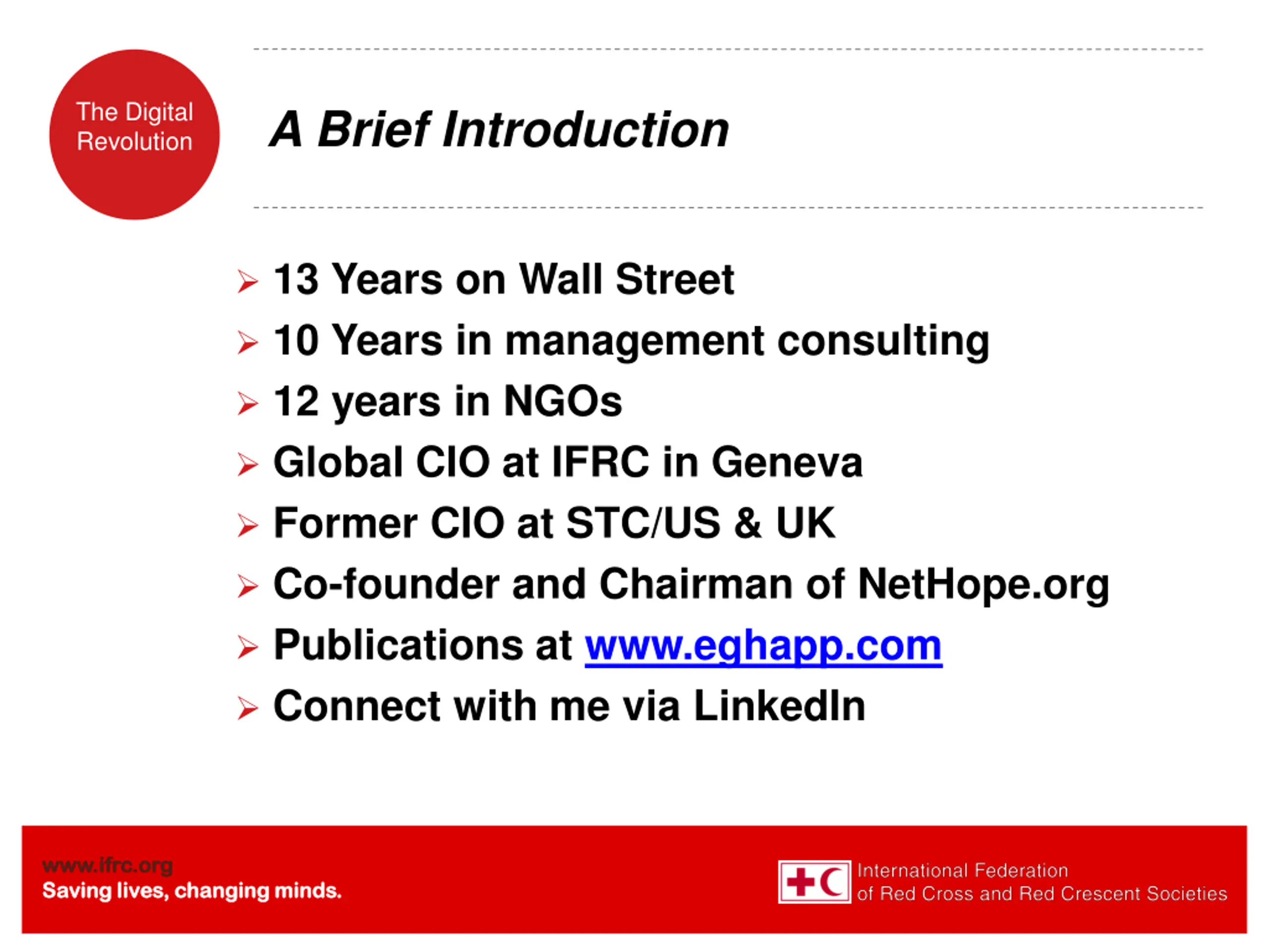 The Digital Revolution A Brief Introduction 13 Years on Wall Street 10 Years in management consulting 12 years in NGOs Global CIO at IFRC in Geneva Former CIO at STC/US & UK Co-founder and Chairman of NetHope.org Publications at www.eghapp.com Connect with me via LinkedIn www.ifrc.org www.ifrc.org Saving lives, changing minds. Saving lives, changing minds.