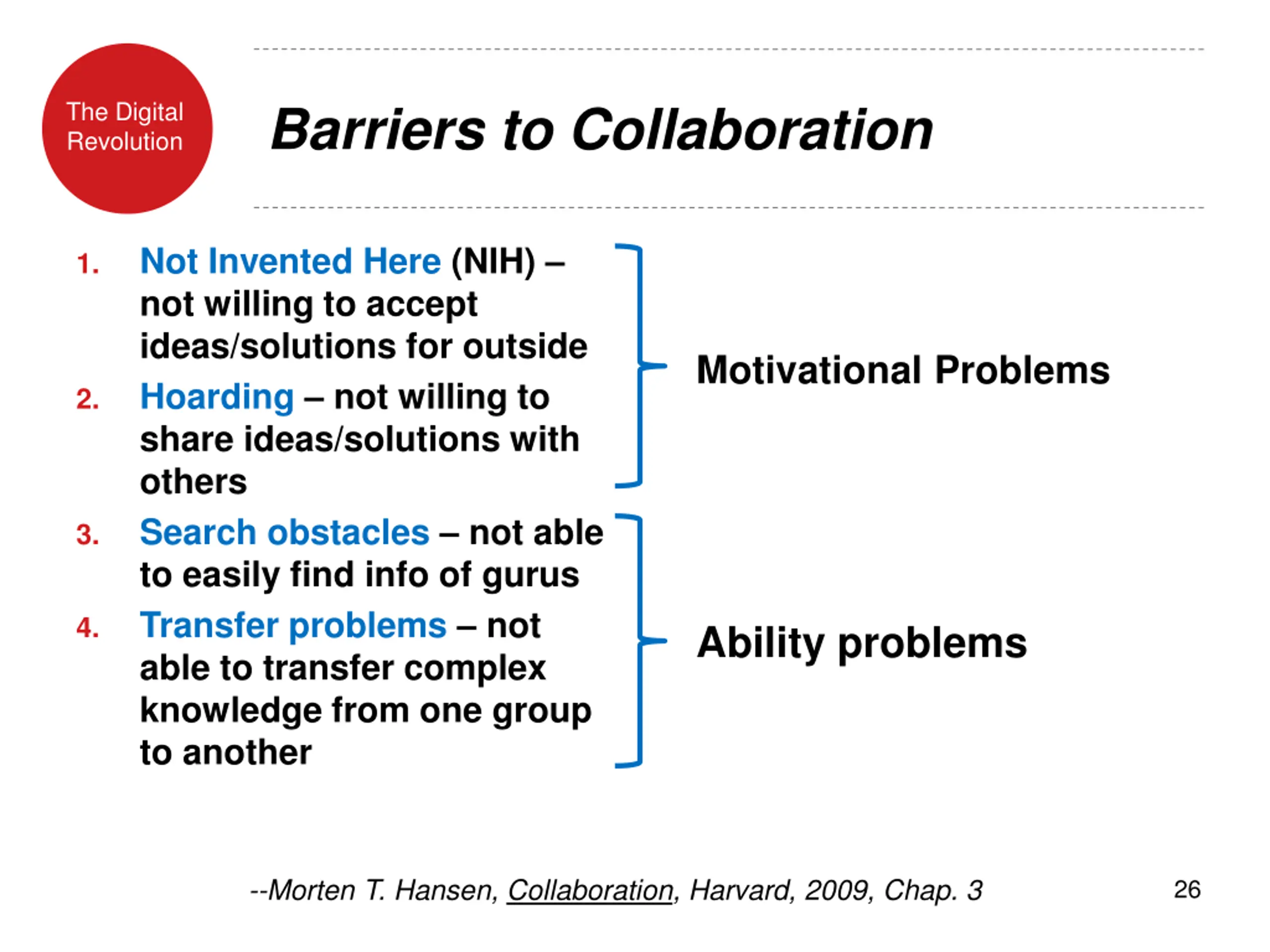 Two Kinds Of Two Kinds Of Social Media Barriers to Collaboration The Digital Revolution Not Invented Here (NIH) not willing to accept ideas/solutions for outside Hoarding not willing to share ideas/solutions with others Search obstacles not able to easily find info of gurus Transfer problems not able to transfer complex knowledge from one group to another 1. Motivational Problems 2. 3. 4. Ability problems --Morten T. Hansen, Collaboration, Harvard, 2009, Chap. 3 26