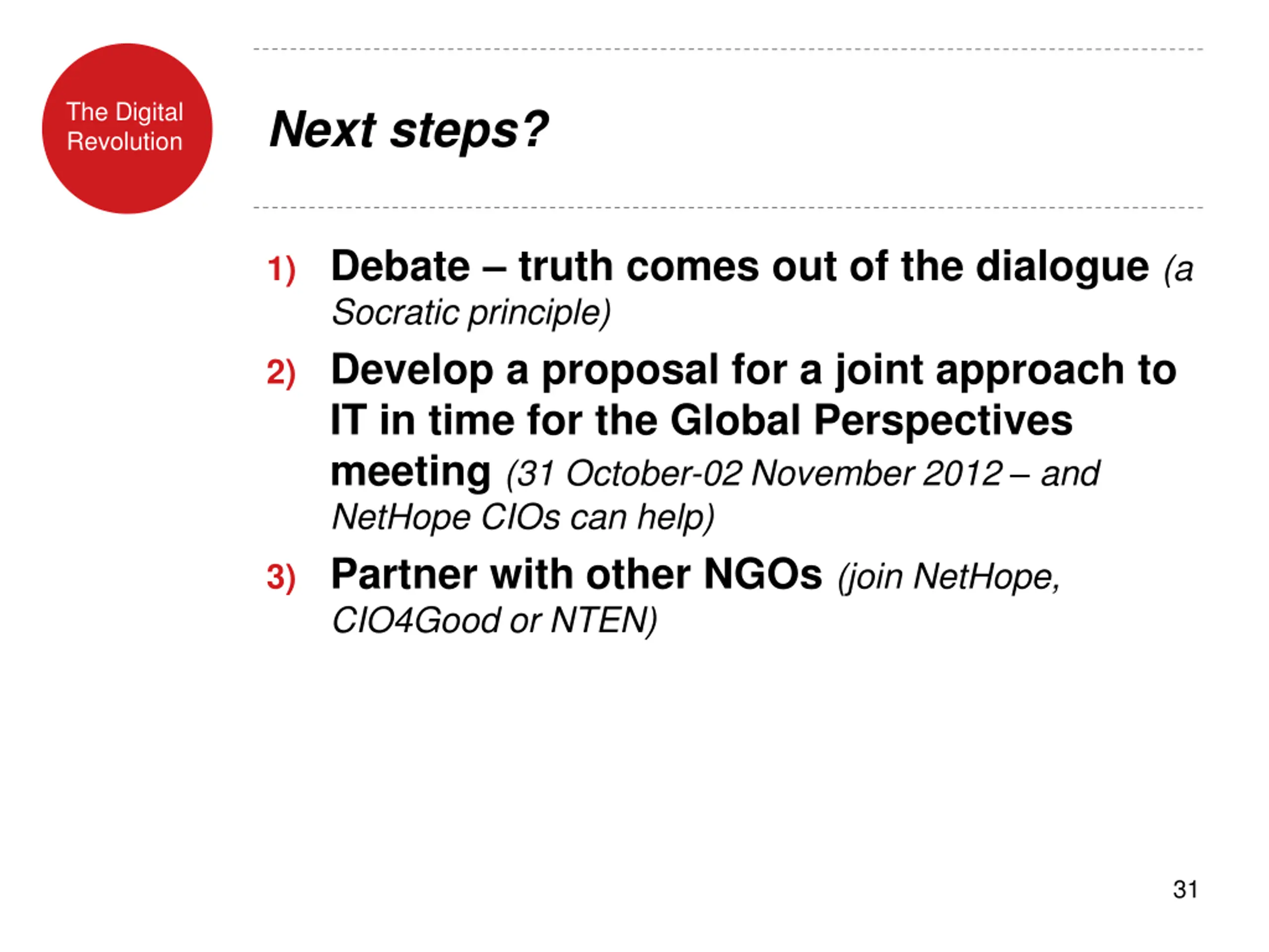 Two Kinds Of Two Kinds Of Social Media The Digital Revolution Next steps? 1) Debate truth comes out of the dialogue (a Socratic principle) 2) Develop a proposal for a joint approach to IT in time for the Global Perspectives meeting (31 October-02 November 2012 and NetHope CIOs can help) 3) Partner with other NGOs (join NetHope, CIO4Good or NTEN) 31