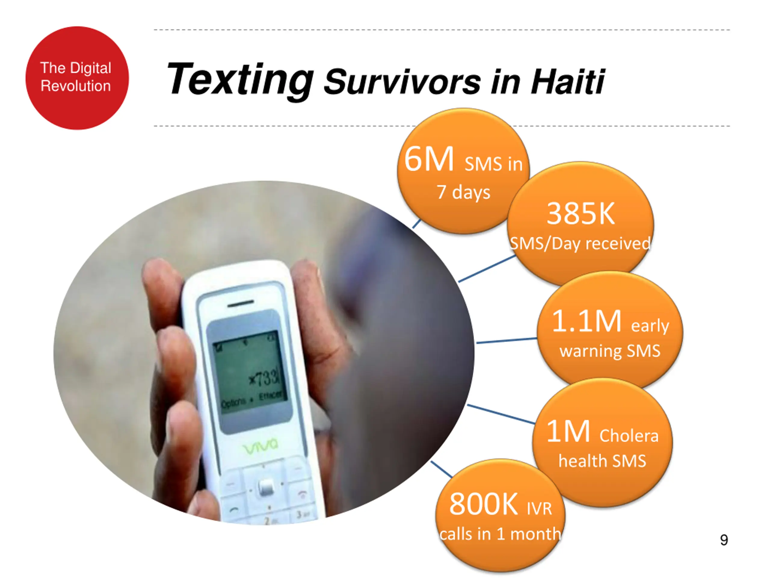 Two Kinds Of Two Kinds Of Social Media Texting Survivors in Haiti The Digital Revolution 6M SMS in 7 days 385K SMS/Day received 1.1M early warning SMS 1M Cholera health SMS 800K IVR calls in 1 month 9