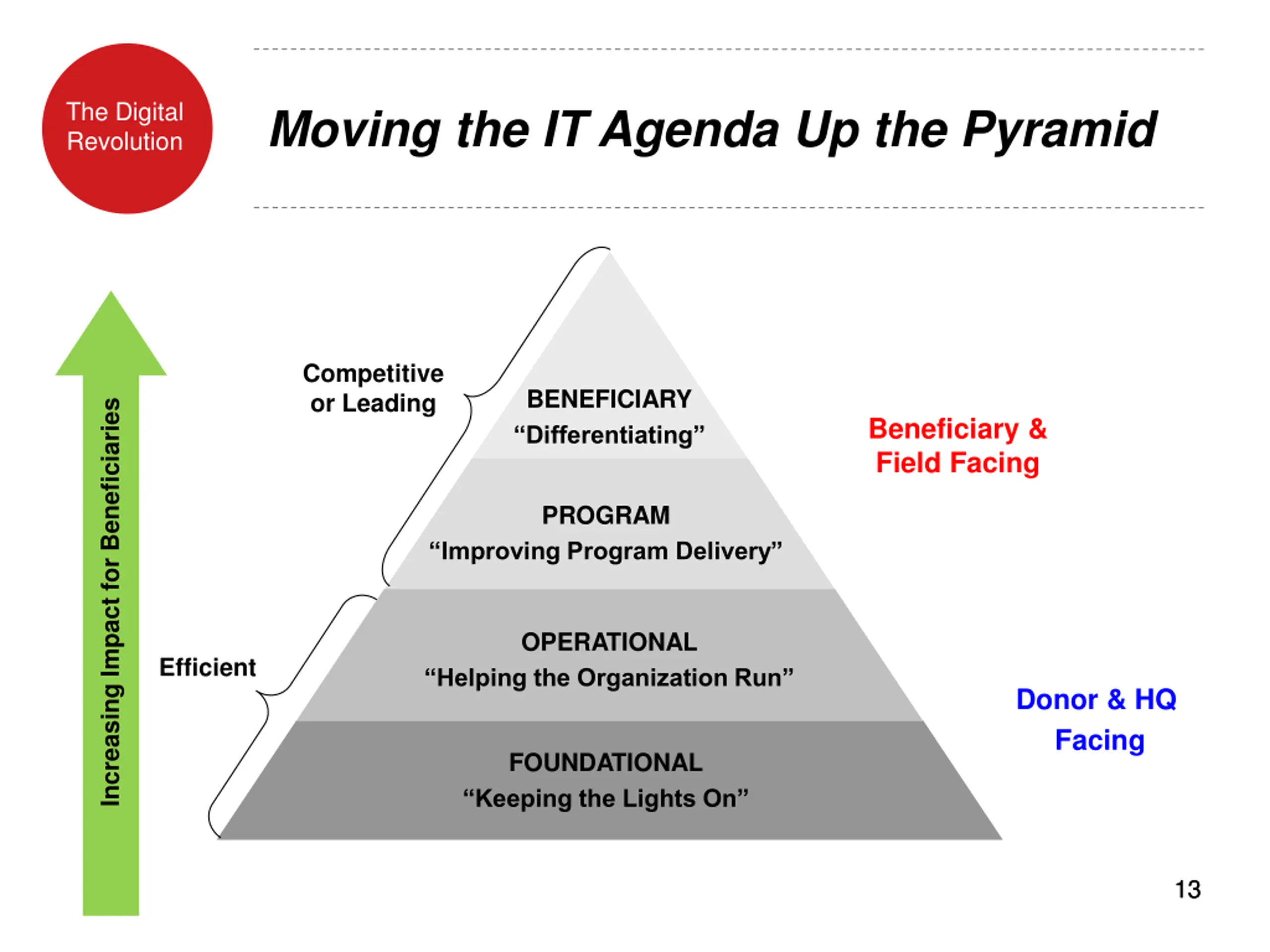 Two Kinds Of Two Kinds Of Social Media The Digital Revolution Moving the IT Agenda Up the Pyramid Increasing Impact for Beneficiaries Competitive or Leading BENEFICIARY Differentiating Increasing Impact for Beneficiaries Beneficiary & Field Facing PROGRAM Improving Program Delivery OPERATIONAL Efficient Helping the Organization Run Donor & HQ Facing FOUNDATIONAL Keeping the Lights On 13 13
