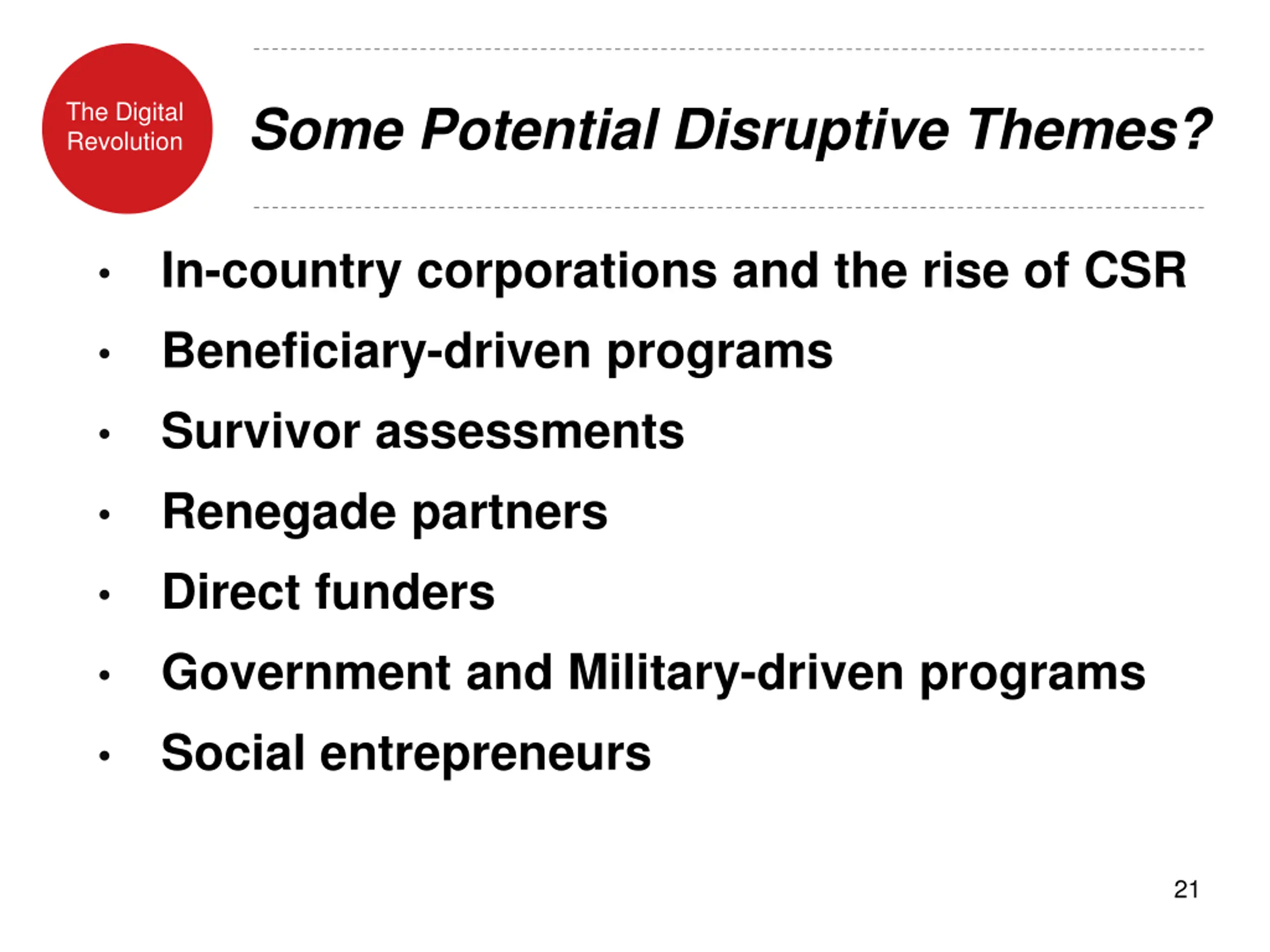 Two Kinds Of Two Kinds Of Social Media Some Potential Disruptive Themes? The Digital Revolution In-country corporations and the rise of CSR Beneficiary-driven programs Survivor assessments Renegade partners Direct funders Government and Military-driven programs Social entrepreneurs 21