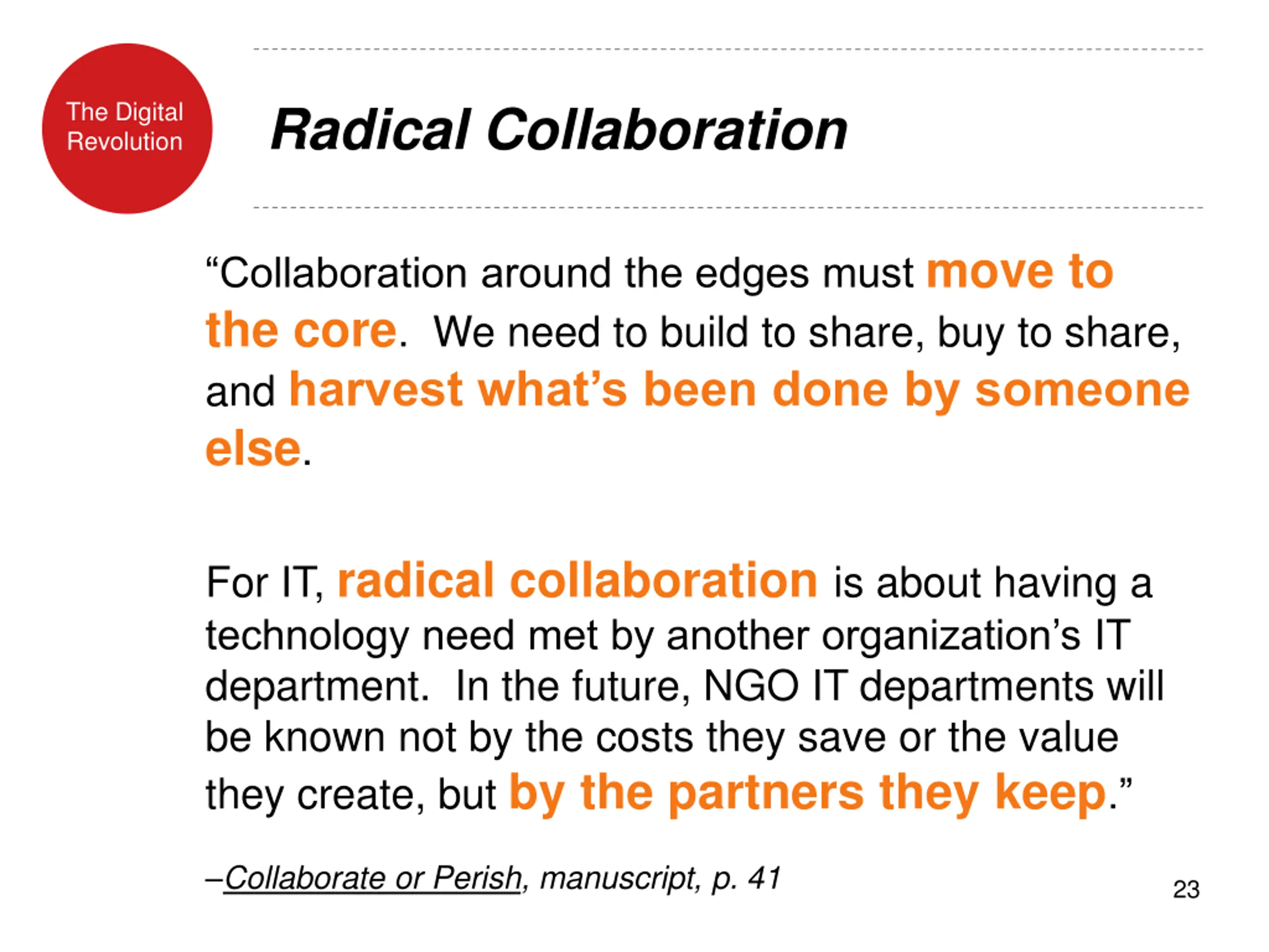 Two Kinds Of Two Kinds Of Social Media Radical Collaboration The Digital Revolution Collaboration around the edges must move to the core. We need to build to share, buy to share, and harvest what s been done by someone else. For IT, radical collaboration is about having a technology need met by another organization s IT department. In the future, NGO IT departments will be known not by the costs they save or the value they create, but by the partners they keep. Collaborate or Perish, manuscript, p. 41 23