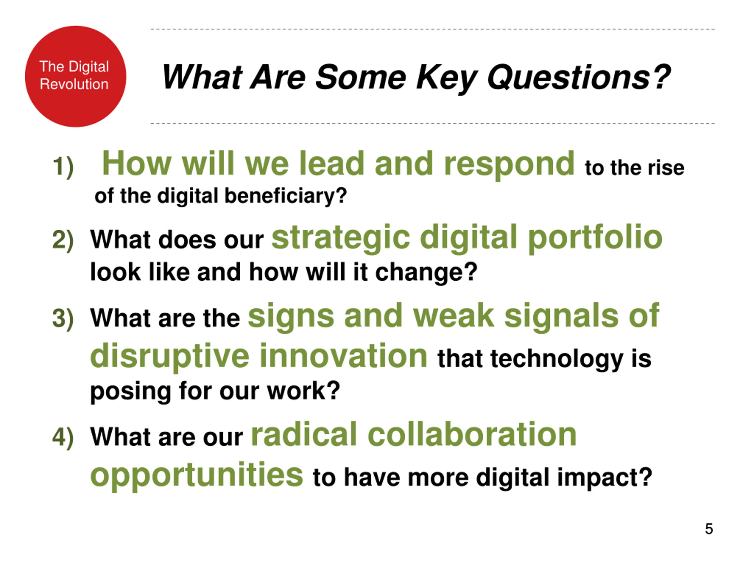 The Digital Revolution We have all participated in the digital revolution, whether it's through the rise of on-line fundraising, social media and ever new devices. Our donors and employees have been at the center of the change. The lessons of Haiti and the Arab Spring are that the next wave of the digital revolution for our work as NGOs is centered on the beneficiary, volunteer and citizen. Let s discuss key strategic questions surrounding these changes. 3