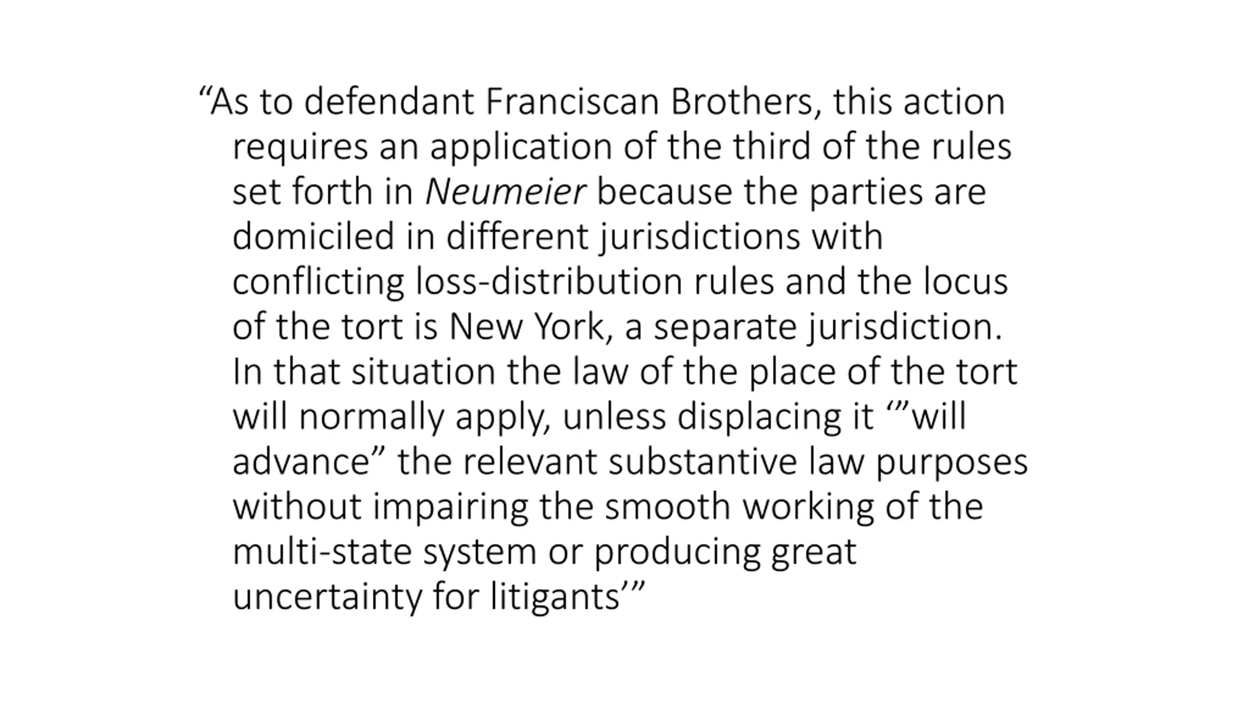As to defendant Franciscan Brothers, this action requires an application of the third of the rules set forth in Neumeier because the parties are domiciled in different jurisdictions with conflicting loss-distribution rules and the locus of the tort is New York, a separate jurisdiction. In that situation the law of the place of the tort will normally apply, unless displacing it will advance the relevant substantive law purposes without impairing the smooth working of the multi-state system or producing great uncertainty for litigants