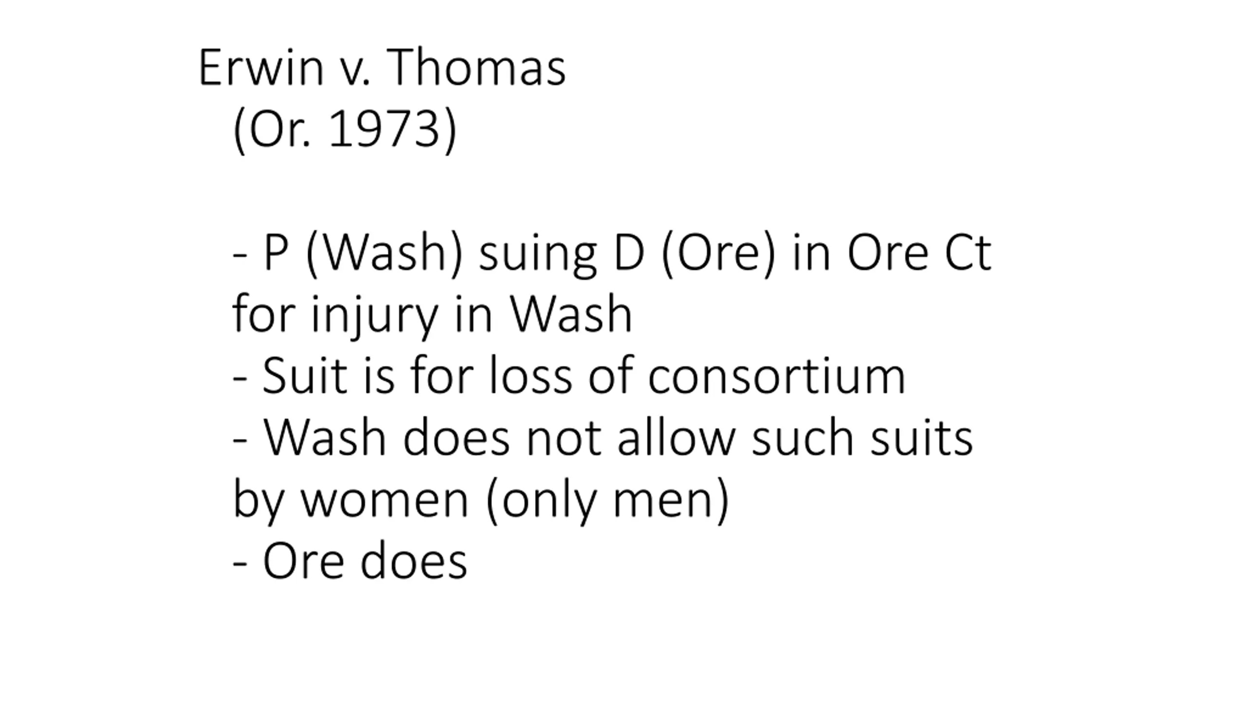 Erwin v. Thomas (Or. 1973) - P (Wash) suing D (Ore) in Ore Ct for injury in Wash - Suit is for loss of consortium - Wash does not allow such suits by women (only men) - Ore does