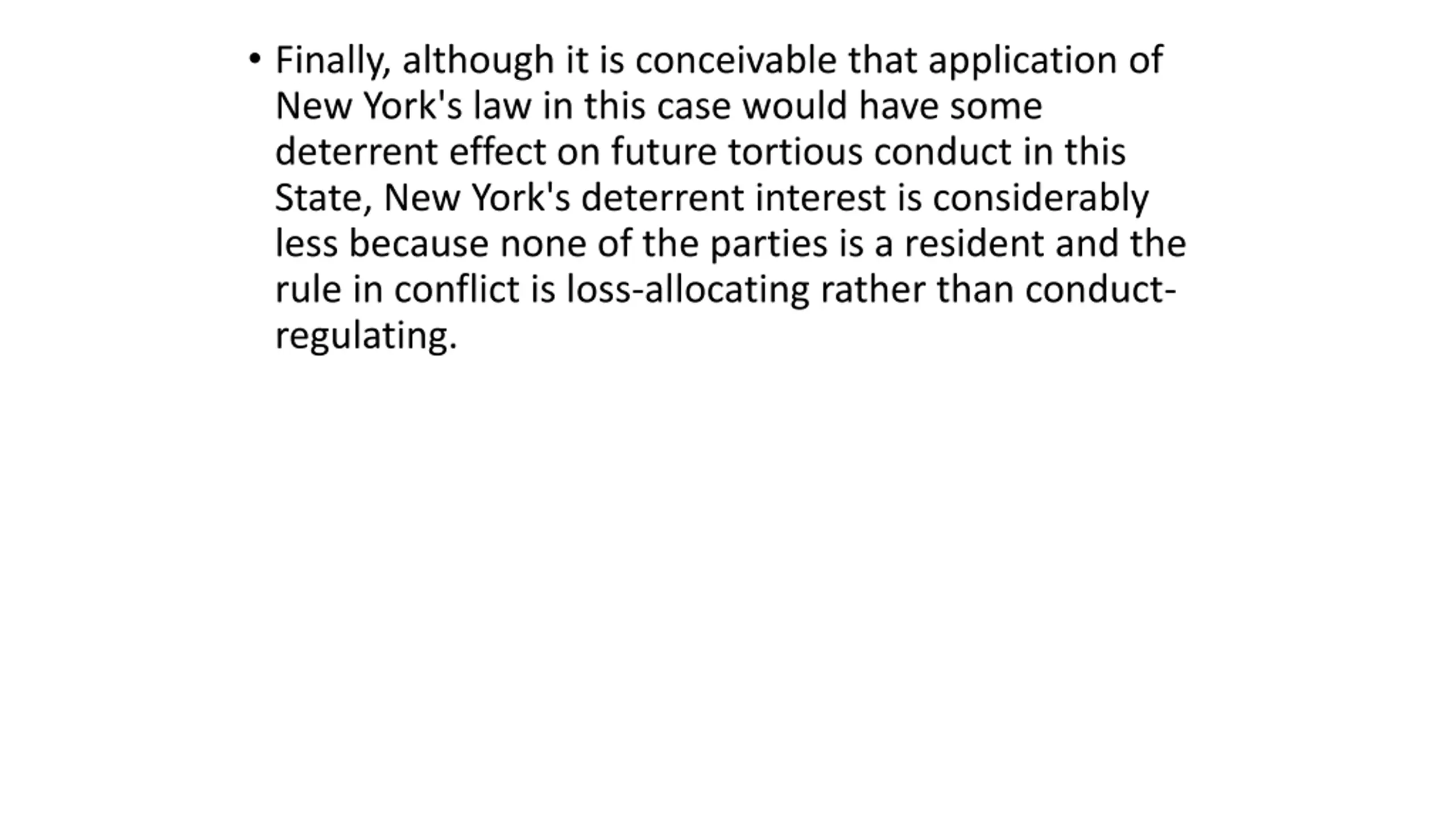 Finally, although it is conceivable that application of New York's law in this case would have some deterrent effect on future tortious conduct in this State, New York's deterrent interest is considerably less because none of the parties is a resident and the rule in conflict is loss-allocating rather than conduct- regulating.