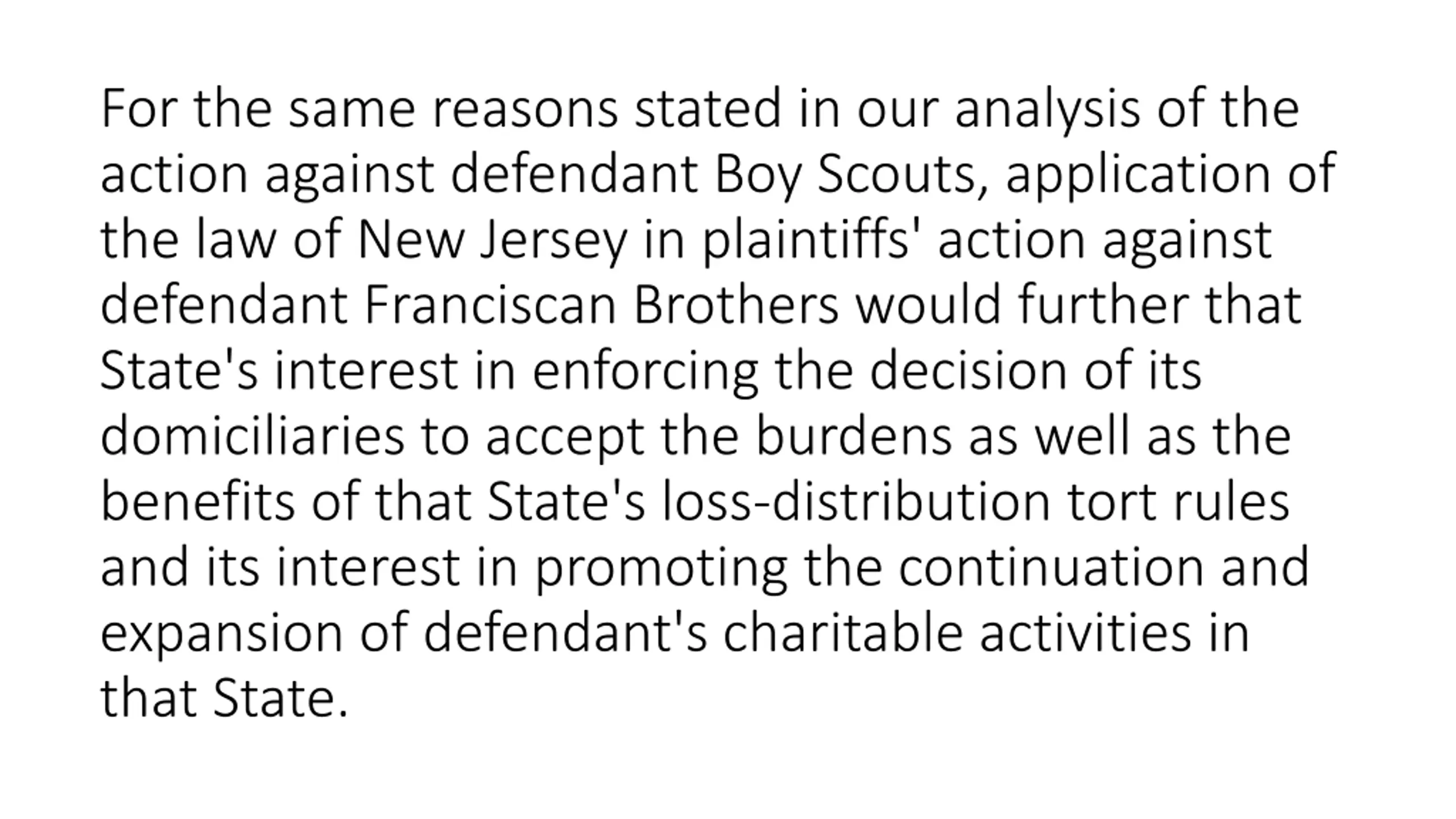 For the same reasons stated in our analysis of the action against defendant Boy Scouts, application of the law of New Jersey in plaintiffs' action against defendant Franciscan Brothers would further that State's interest in enforcing the decision of its domiciliaries to accept the burdens as well as the benefits of that State's loss-distribution tort rules and its interest in promoting the continuation and expansion of defendant's charitable activities in that State.