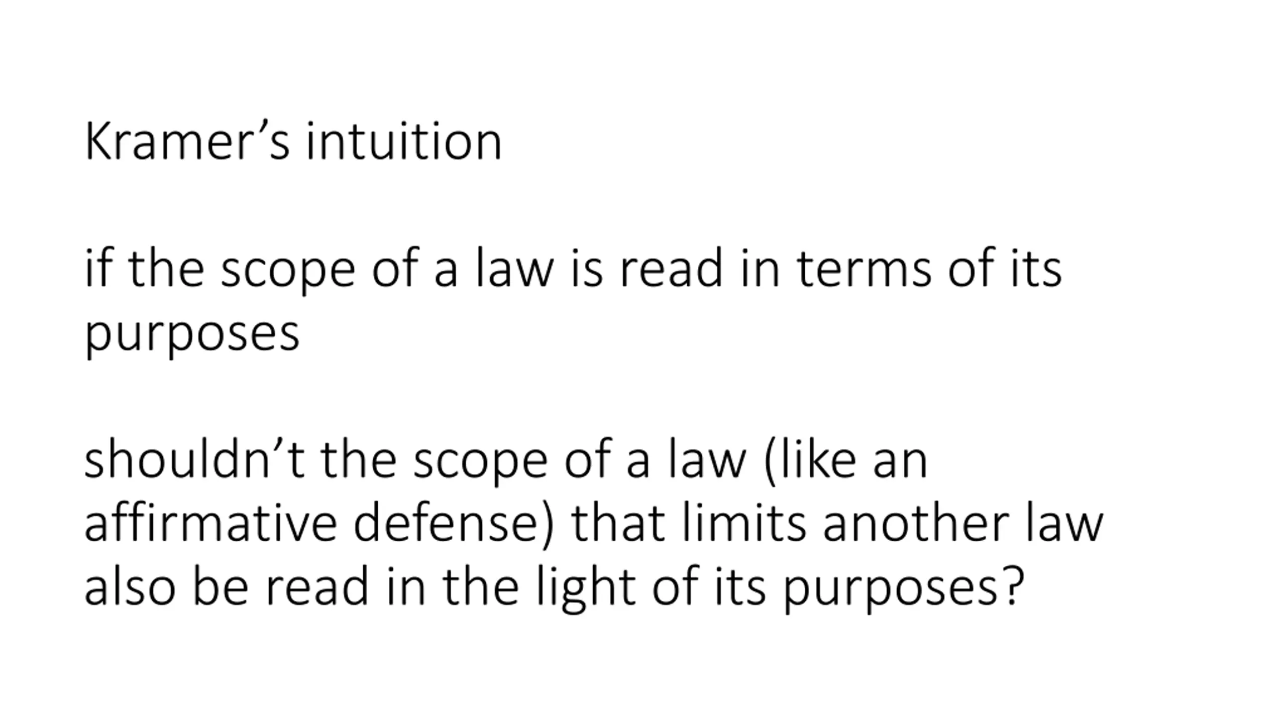 Kramers intuition if the scope of a law is read in terms of its purposes shouldn t the scope of a law (like an affirmative defense) that limits another law also be read in the light of its purposes?