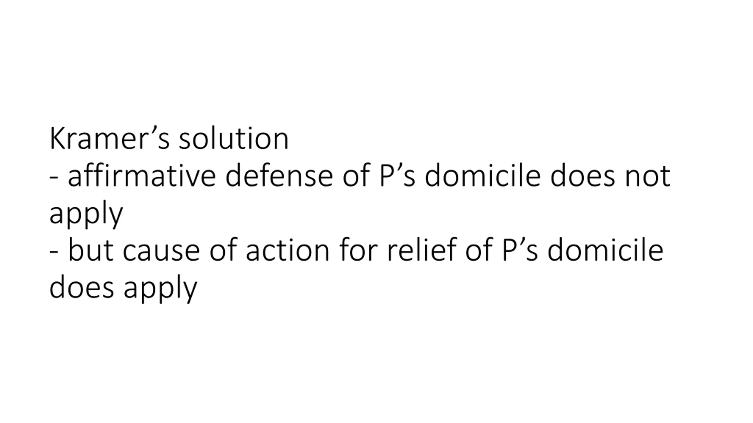 Kramers solution - affirmative defense of P s domicile does not apply - but cause of action for relief of P s domicile does apply
