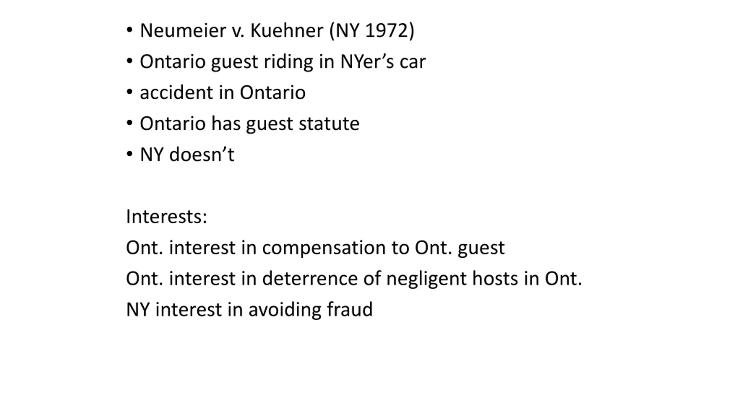 Neumeier v. Kuehner (NY 1972) Ontario guest riding in NYer s car accident in Ontario Ontario has guest statute NY doesn t Interests: Ont. interest in compensation to Ont. guest Ont. interest in deterrence of negligent hosts in Ont. NY interest in avoiding fraud