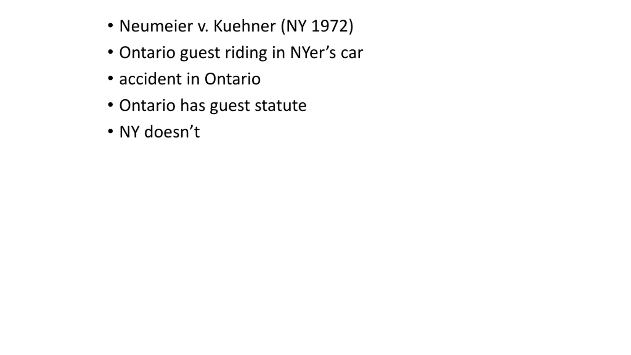 Neumeier v. Kuehner (NY 1972) Ontario guest riding in NYer s car accident in Ontario Ontario has guest statute NY doesn t