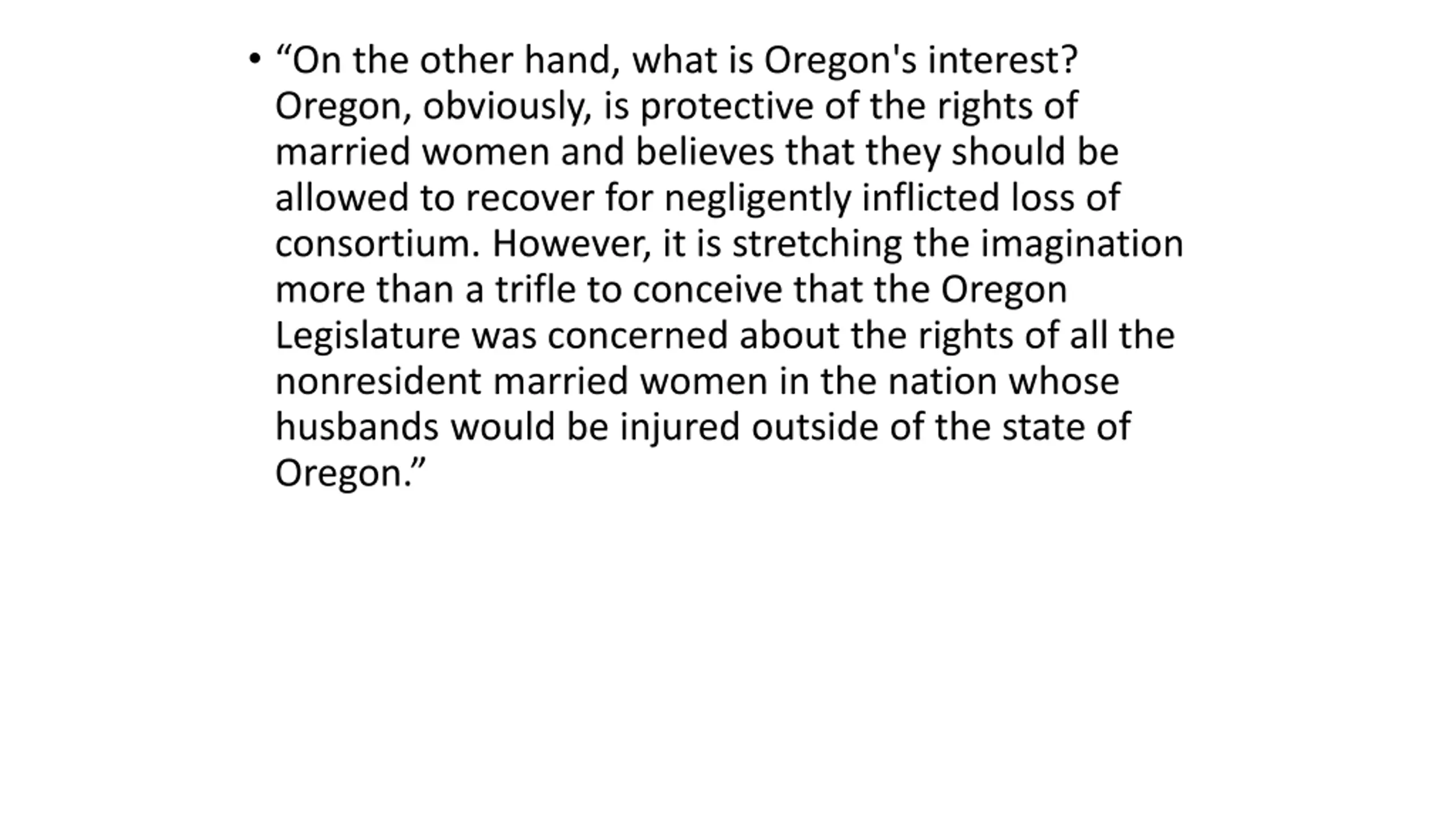 On the other hand, what is Oregon's interest? Oregon, obviously, is protective of the rights of married women and believes that they should be allowed to recover for negligently inflicted loss of consortium. However, it is stretching the imagination more than a trifle to conceive that the Oregon Legislature was concerned about the rights of all the nonresident married women in the nation whose husbands would be injured outside of the state of Oregon.