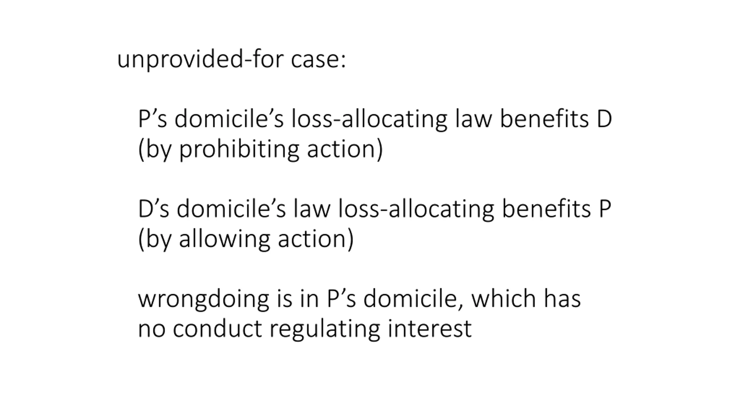 unprovided-for case: P s domicile s loss-allocating law benefits D (by prohibiting action) D s domicile s law loss-allocating benefits P (by allowing action) wrongdoing is in P s domicile, which has no conduct regulating interest