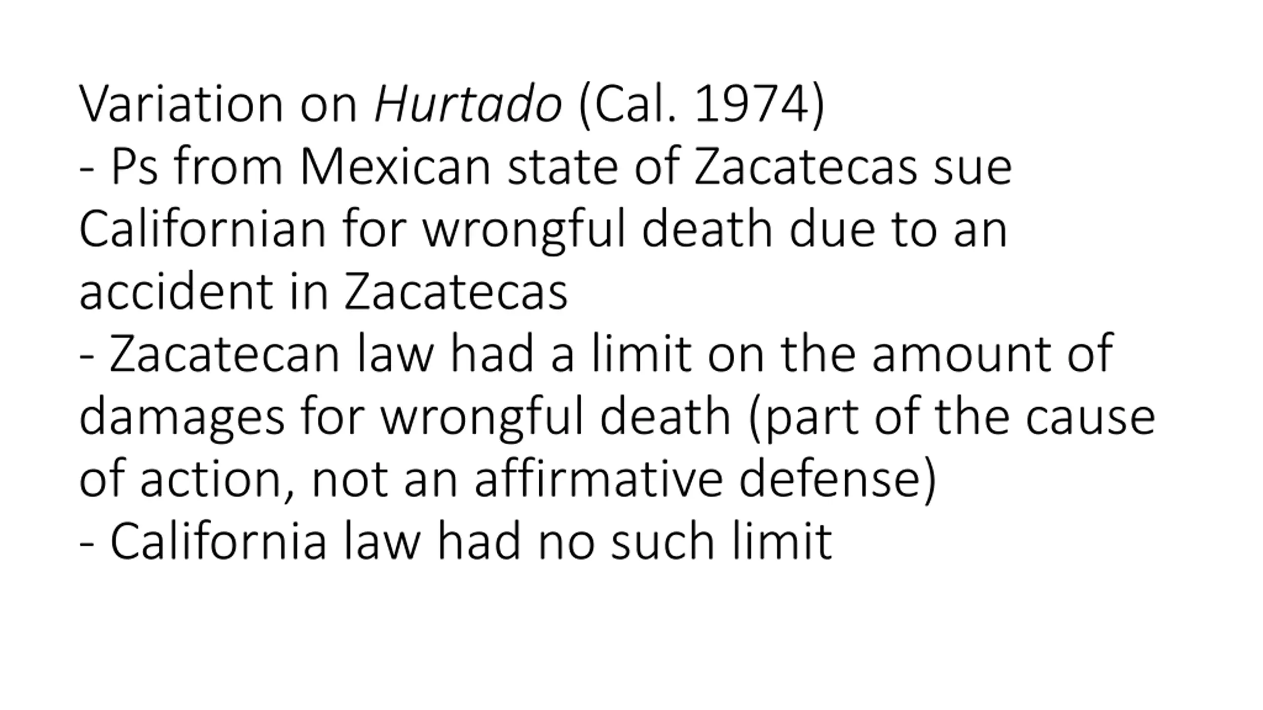 Variation on Hurtado (Cal. 1974) - Ps from Mexican state of Zacatecas sue Californian for wrongful death due to an accident in Zacatecas - Zacatecan law had a limit on the amount of damages for wrongful death (part of the cause of action, not an affirmative defense) - California law had no such limit