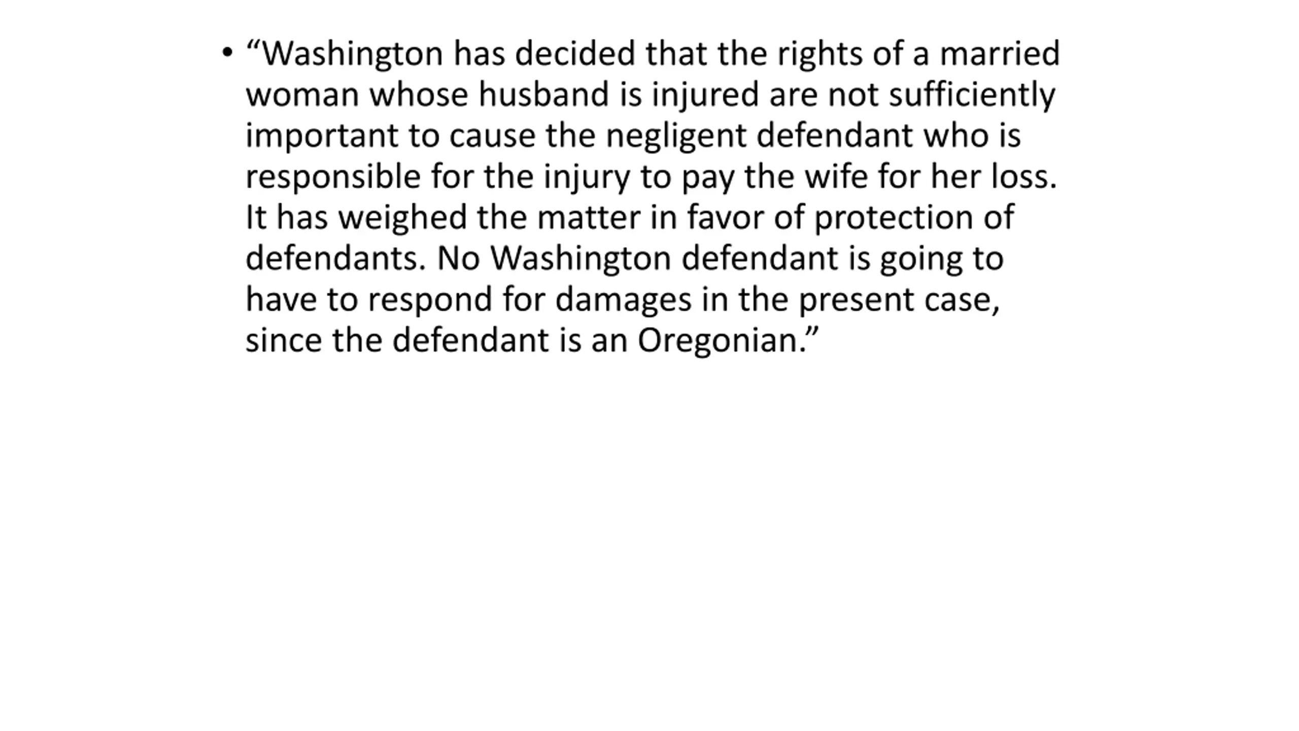 Washington has decided that the rights of a married woman whose husband is injured are not sufficiently important to cause the negligent defendant who is responsible for the injury to pay the wife for her loss. It has weighed the matter in favor of protection of defendants. No Washington defendant is going to have to respond for damages in the present case, since the defendant is an Oregonian.