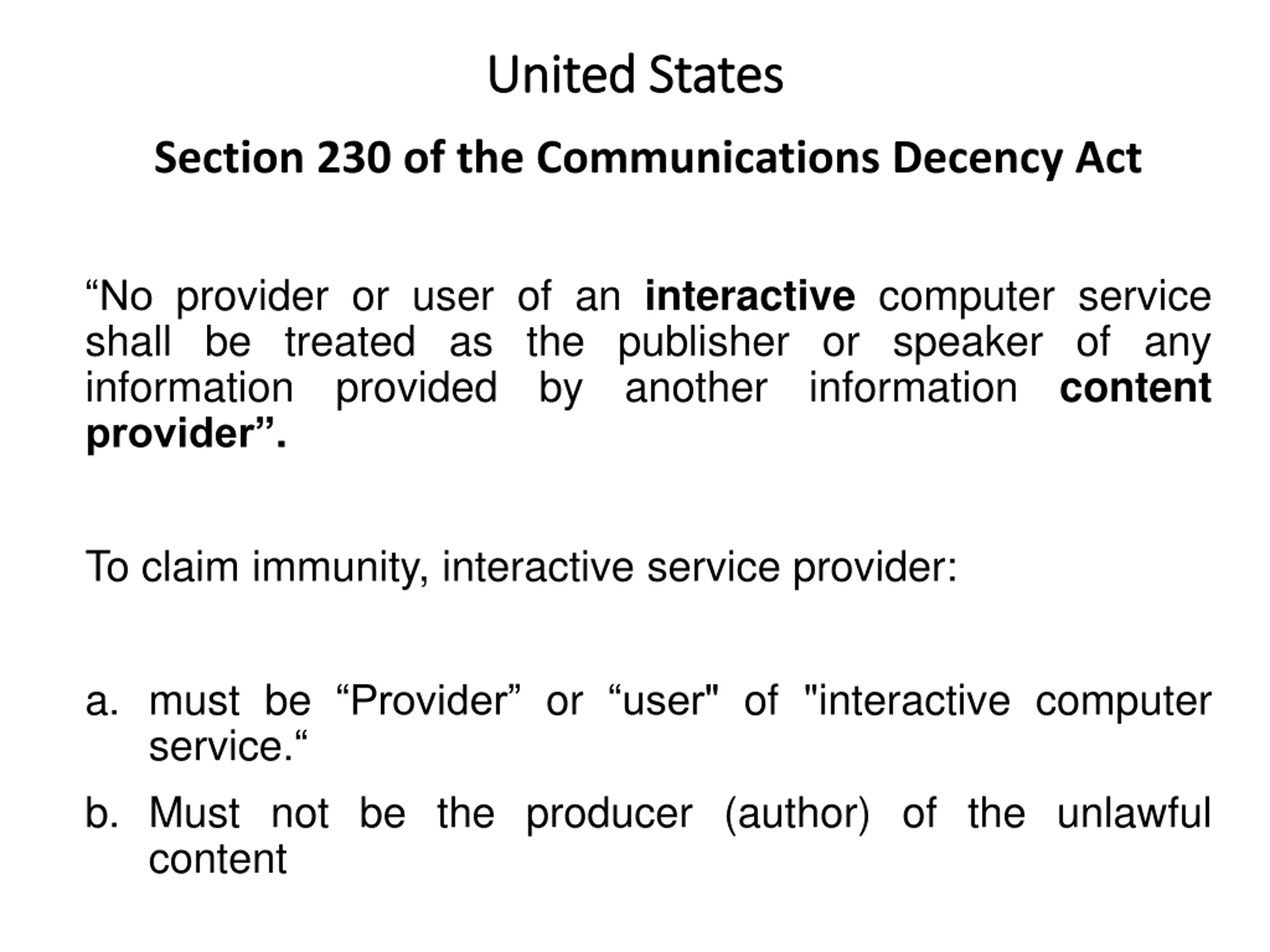 United States United States Section 230 of the Communications Decency Act No provider or user of an interactive computer service shall be treated as the publisher or speaker of any information provided by another provider . information content To claim immunity, interactive service provider: a. must be Provider or user" of "interactive computer service. b. Must not be the producer (author) of the unlawful content