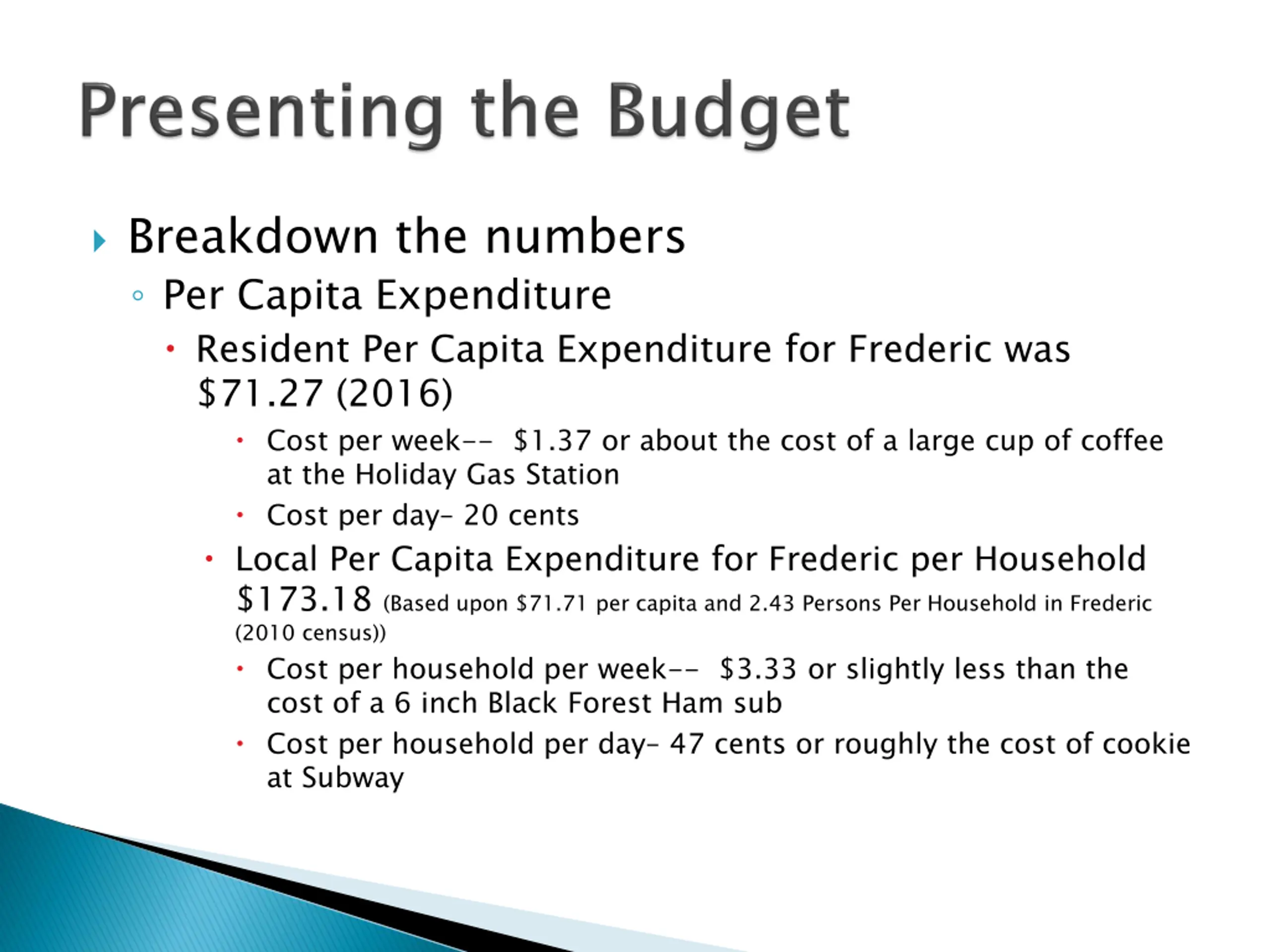 Breakdown the numbers Per Capita Expenditure Resident Per Capita Expenditure for Frederic was $71.27 (2016) Cost per week-- $1.37 or about the cost of a large cup of coffee at the Holiday Gas Station Cost per day 20 cents Local Per Capita Expenditure for Frederic per Household $173.18 (Based upon $71.71 per capita and 2.43 Persons Per Household in Frederic (2010 census)) Cost per household per week-- $3.33 or slightly less than the cost of a 6 inch Black Forest Ham sub Cost per household per day 47 cents or roughly the cost of cookie at Subway