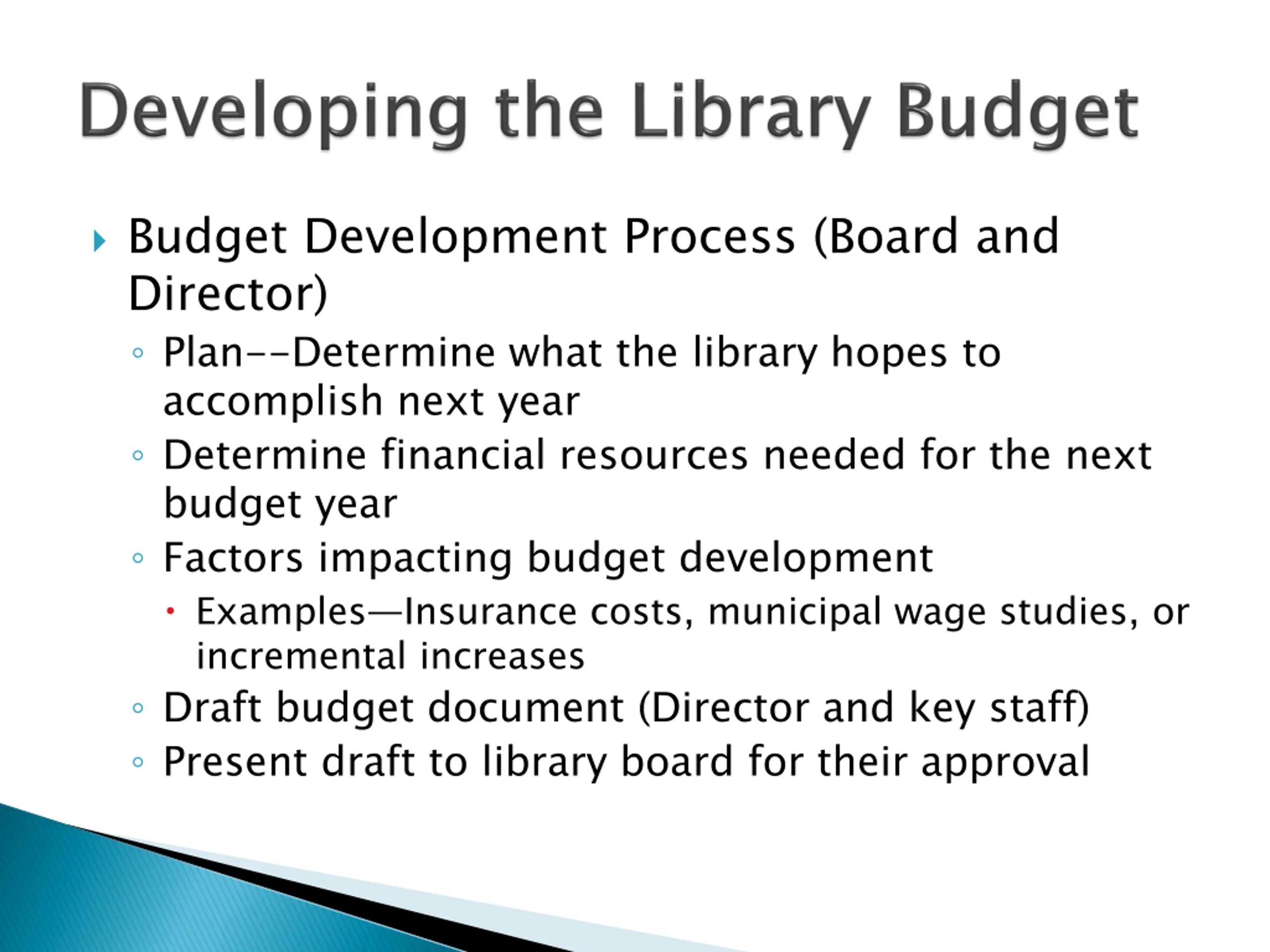Budget Development Process (Board and Director) Plan--Determine what the library hopes to accomplish next year Determine financial resources needed for the next budget year Factors impacting budget development Examples Insurance costs, municipal wage studies, or incremental increases Draft budget document (Director and key staff) Present draft to library board for their approval