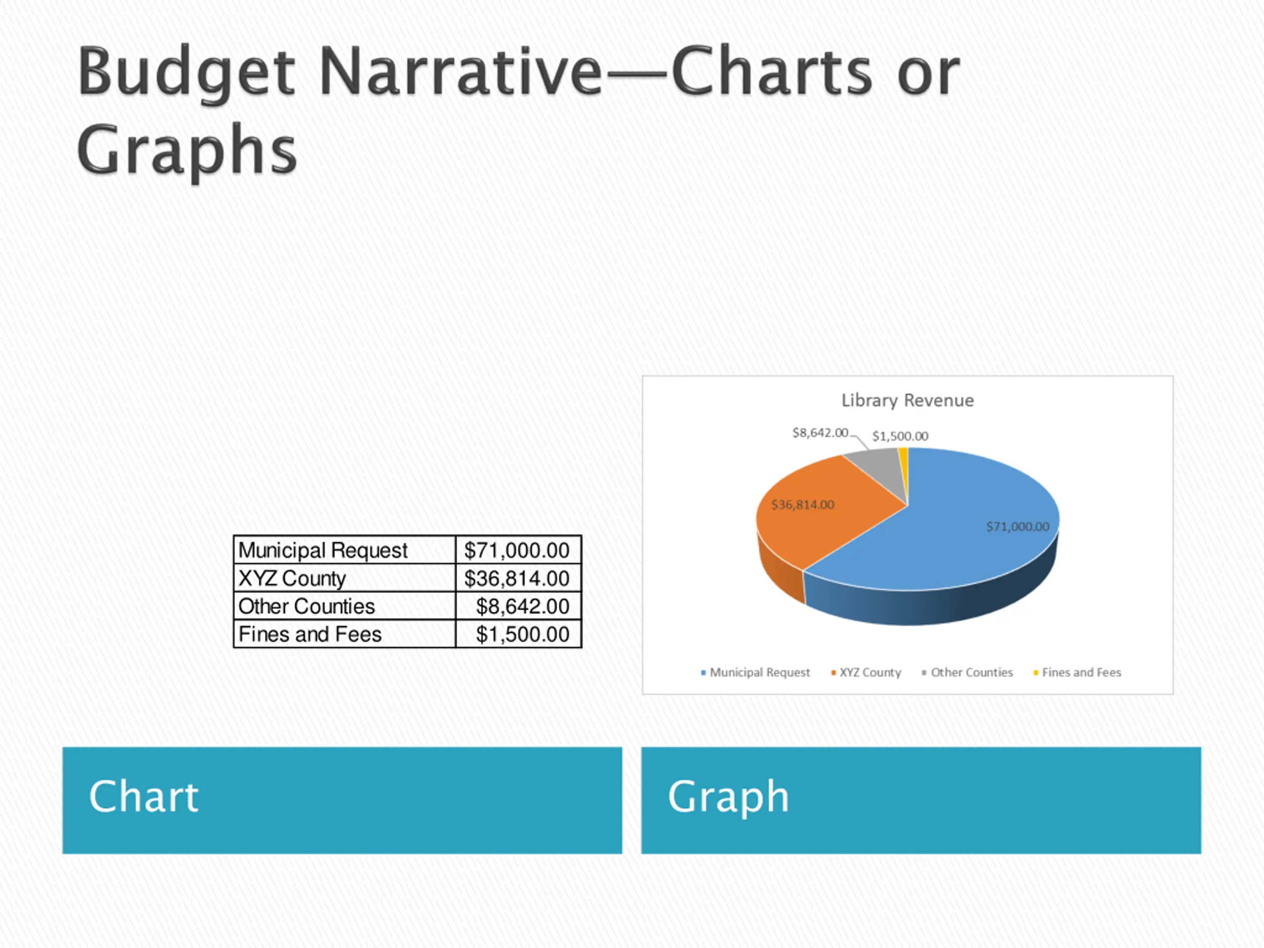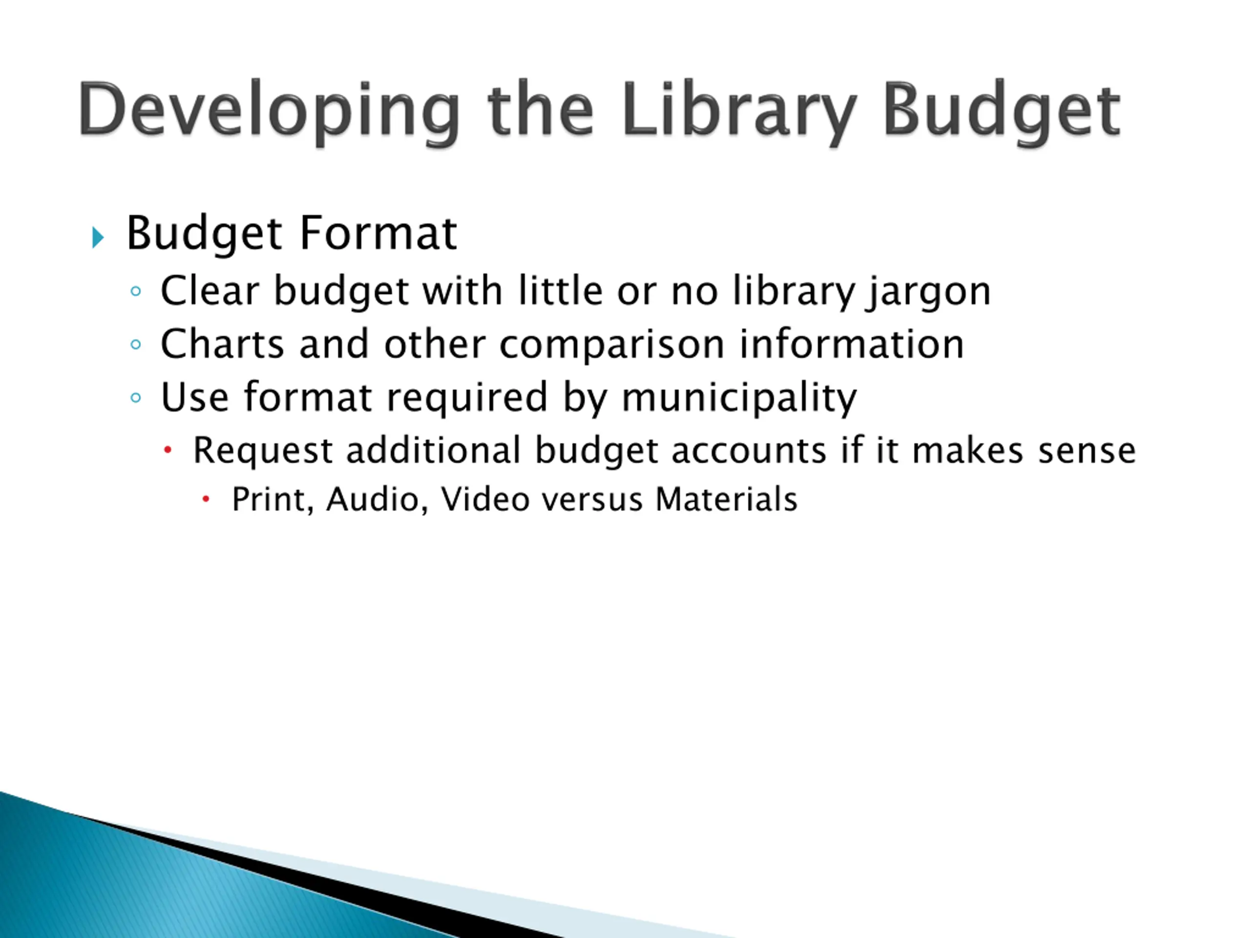 Budget Format Clear budget with little or no library jargon Charts and other comparison information Use format required by municipality Request additional budget accounts if it makes sense Print, Audio, Video versus Materials