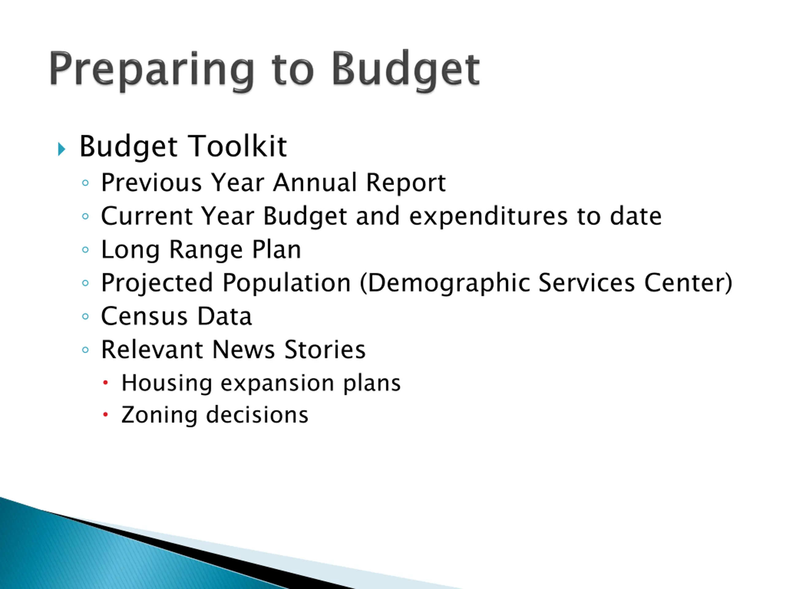 Budget Toolkit Previous Year Annual Report Current Year Budget and expenditures to date Long Range Plan Projected Population (Demographic Services Center) Census Data Relevant News Stories Housing expansion plans Zoning decisions