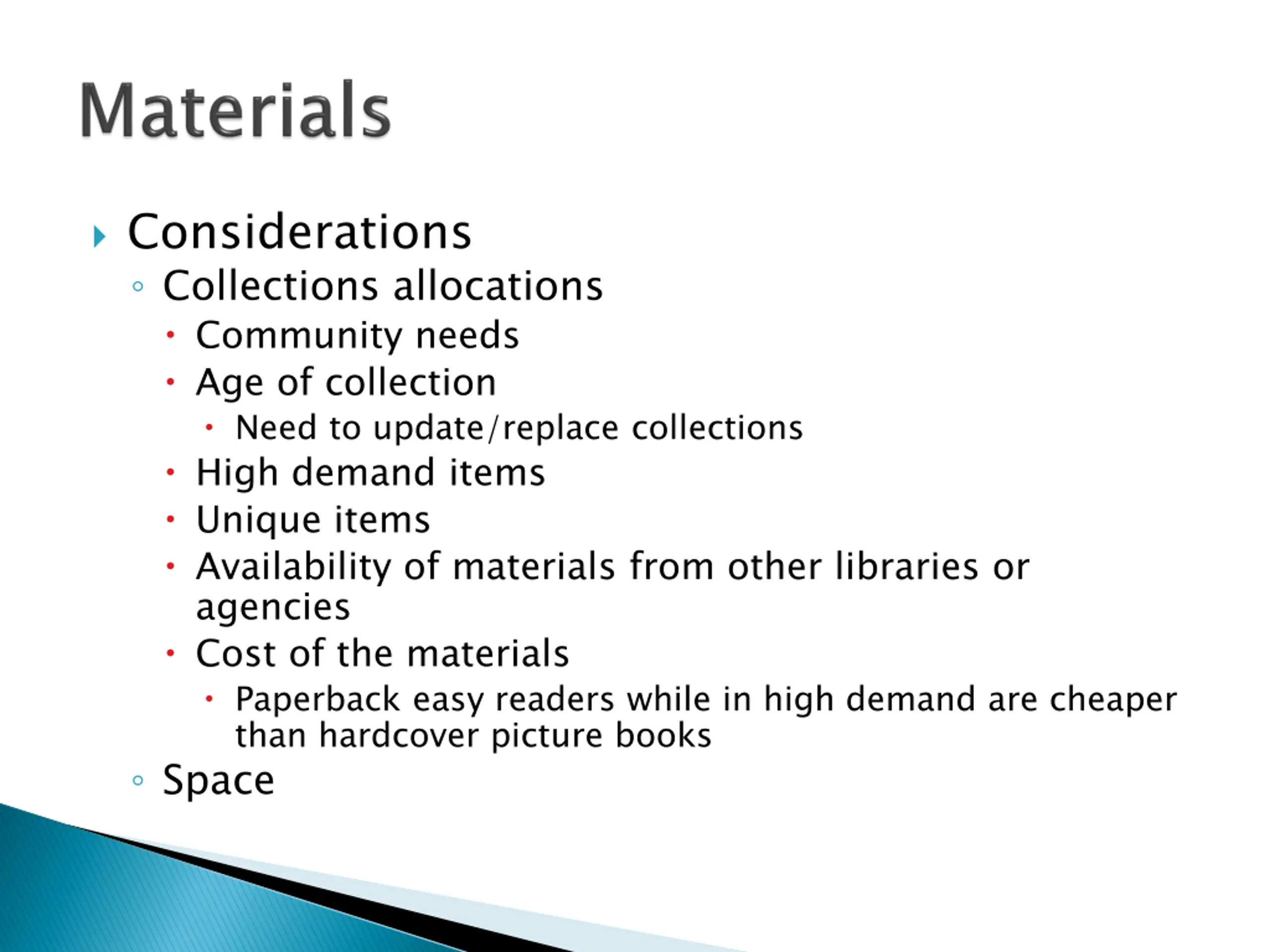 Considerations Collections allocations Community needs Age of collection Need to update/replace collections High demand items Unique items Availability of materials from other libraries or agencies Cost of the materials Paperback easy readers while in high demand are cheaper than hardcover picture books Space