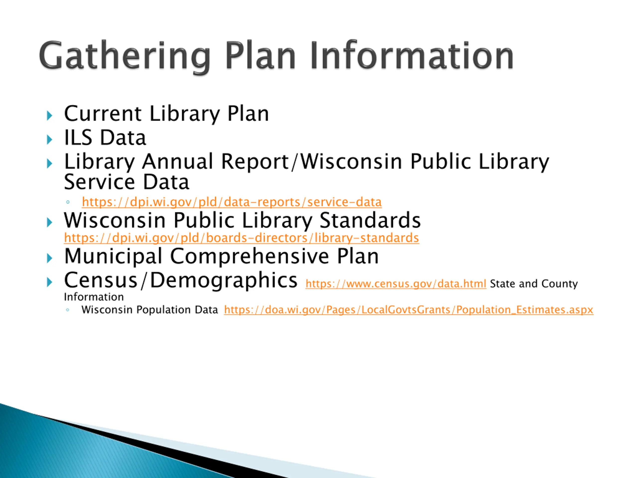 Current Library Plan ILS Data Library Annual Report/Wisconsin Public Library Service Data https://dpi.wi.gov/pld/data-reports/service-data Wisconsin Public Library Standards https://dpi.wi.gov/pld/boards-directors/library-standards Municipal Comprehensive Plan Census/Demographics https://www.census.gov/data.html State and County Information Wisconsin Population Data https://doa.wi.gov/Pages/LocalGovtsGrants/Population_Estimates.aspx