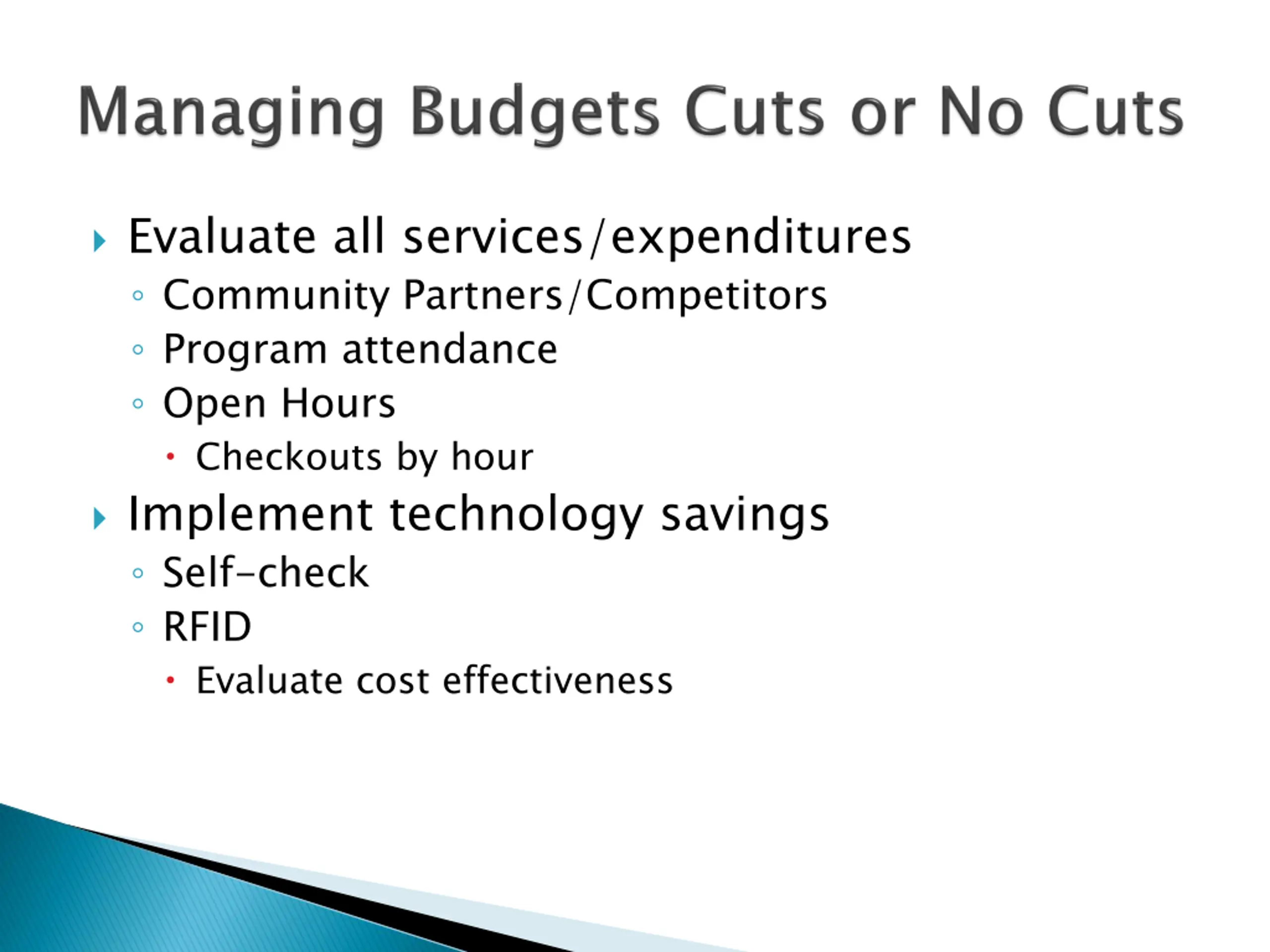 Evaluate all services/expenditures Community Partners/Competitors Program attendance Open Hours Checkouts by hour Implement technology savings Self-check RFID Evaluate cost effectiveness