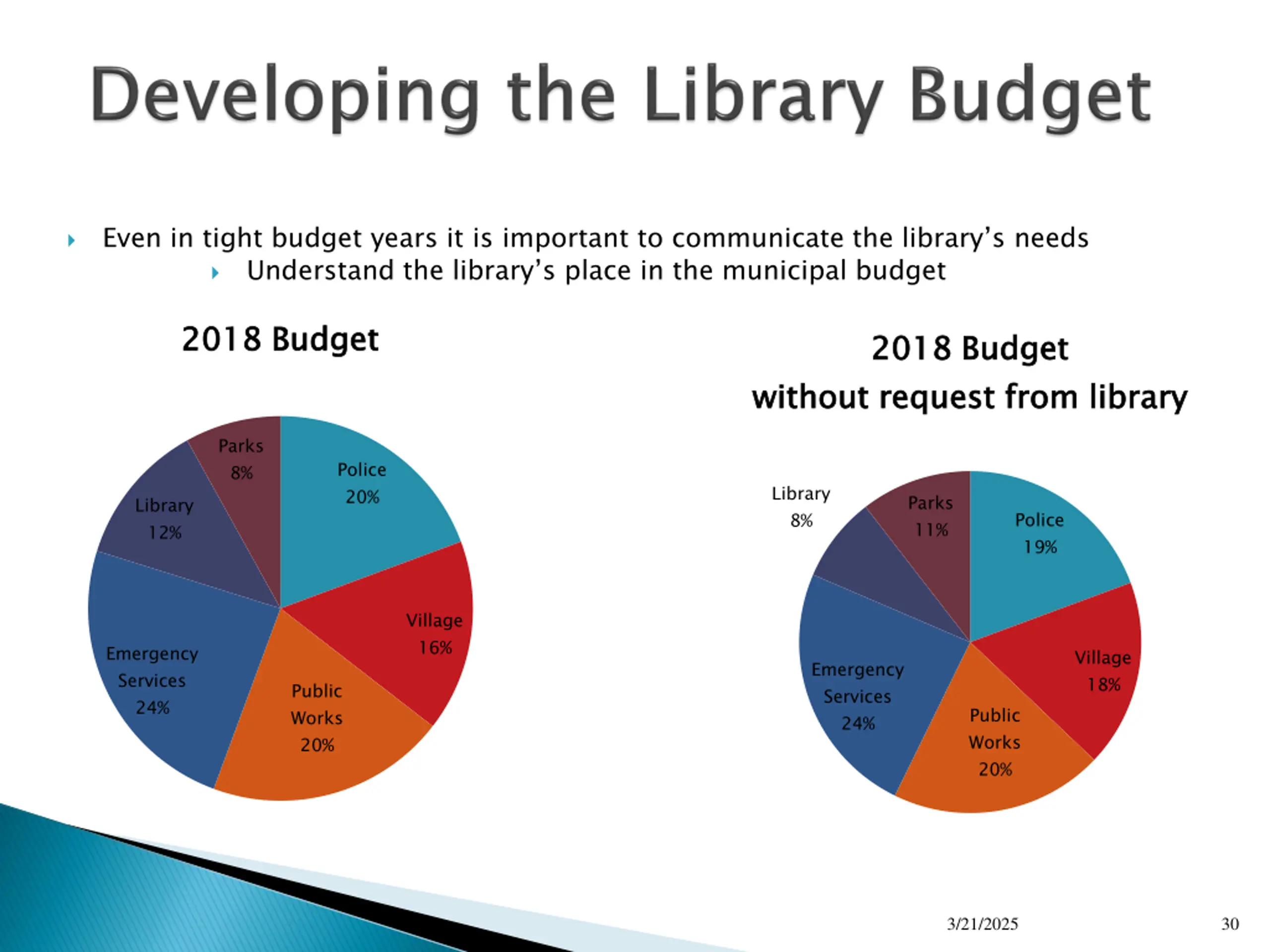 Even in tight budget years it is important to communicate the librarys needs Understand the library s place in the municipal budget 2018 Budget 2018 Budget 2018 Budget 2018 Budget without request from library without request from library Parks 8% Police 20% Library 8% Parks 11% Library 12% Police 19% Village 16% Emergency Services 24% Village 18% Emergency Services 24% Public Works 20% Public Works 20% 30 3/21/2025