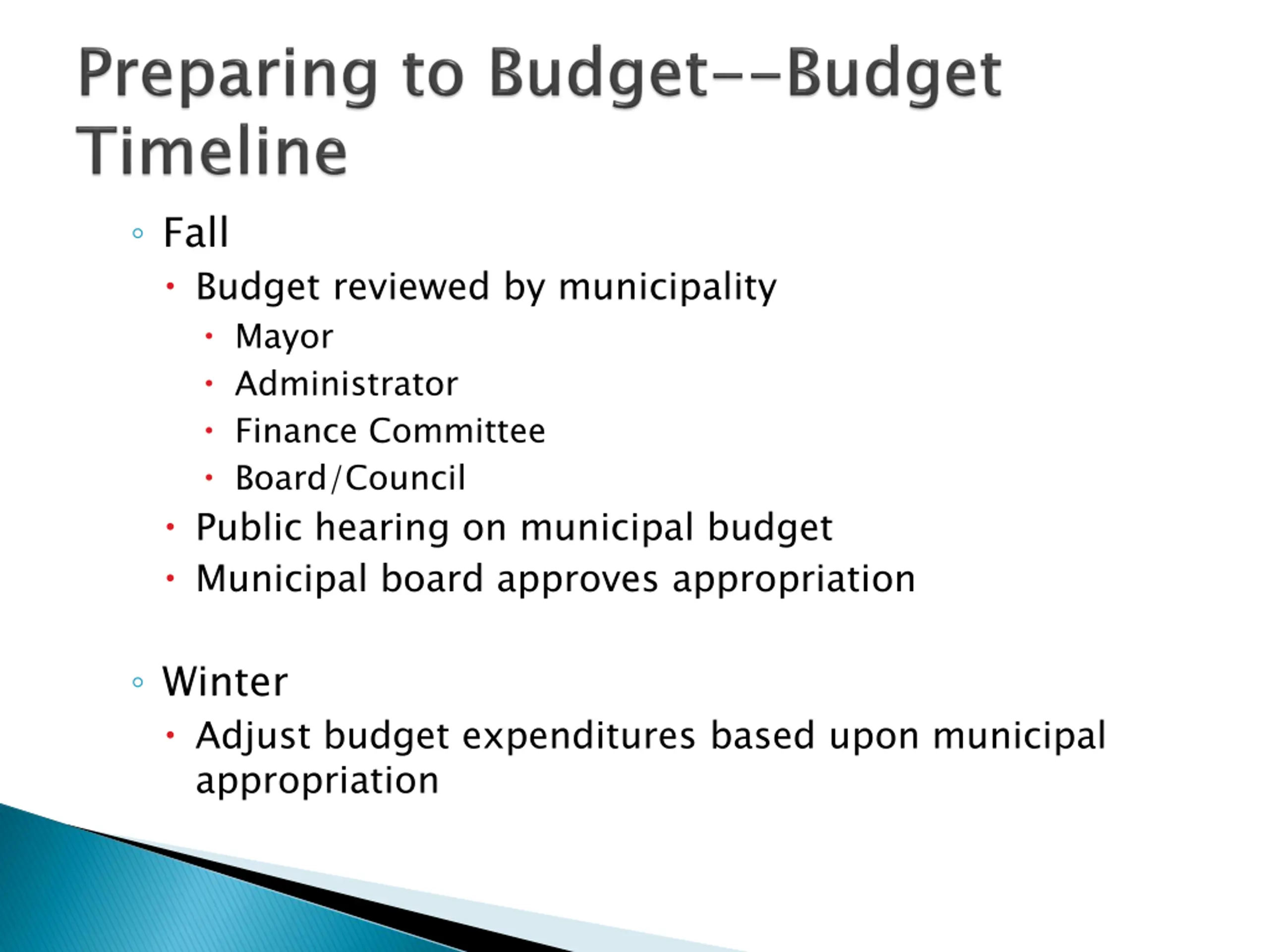 Fall Budget reviewed by municipality Mayor Administrator Finance Committee Board/Council Public hearing on municipal budget Municipal board approves appropriation Winter Adjust budget expenditures based upon municipal appropriation