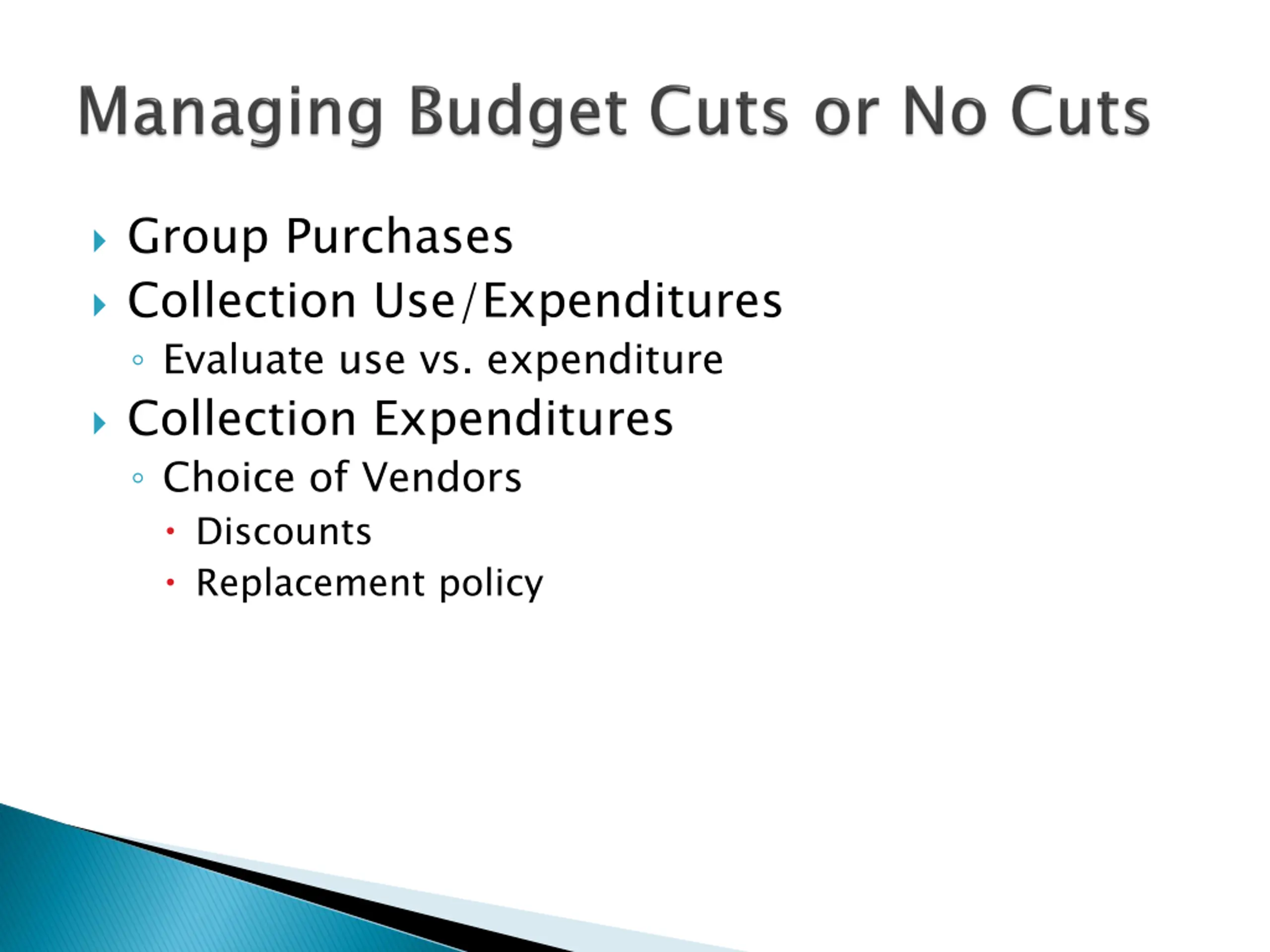 Group Purchases Collection Use/Expenditures Evaluate use vs. expenditure Collection Expenditures Choice of Vendors Discounts Replacement policy