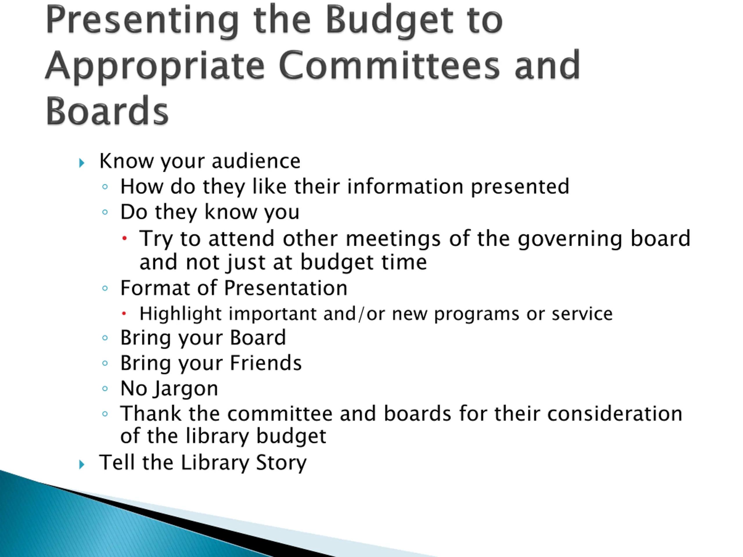 Know your audience How do they like their information presented Do they know you Try to attend other meetings of the governing board and not just at budget time Format of Presentation Highlight important and/or new programs or service Bring your Board Bring your Friends No Jargon Thank the committee and boards for their consideration of the library budget Tell the Library Story