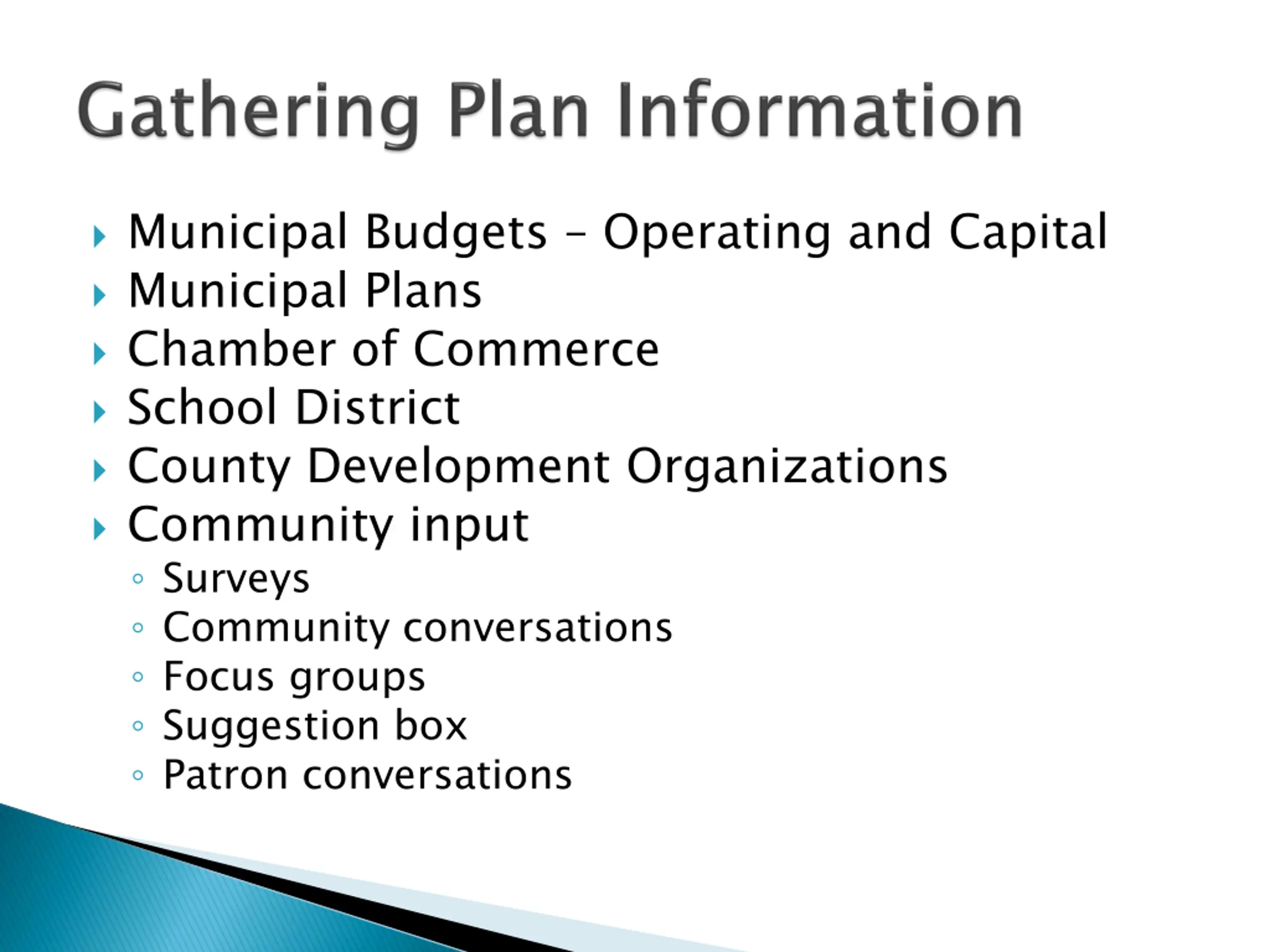 Municipal Budgets Operating and Capital Municipal Plans Chamber of Commerce School District County Development Organizations Community input Surveys Community conversations Focus groups Suggestion box Patron conversations