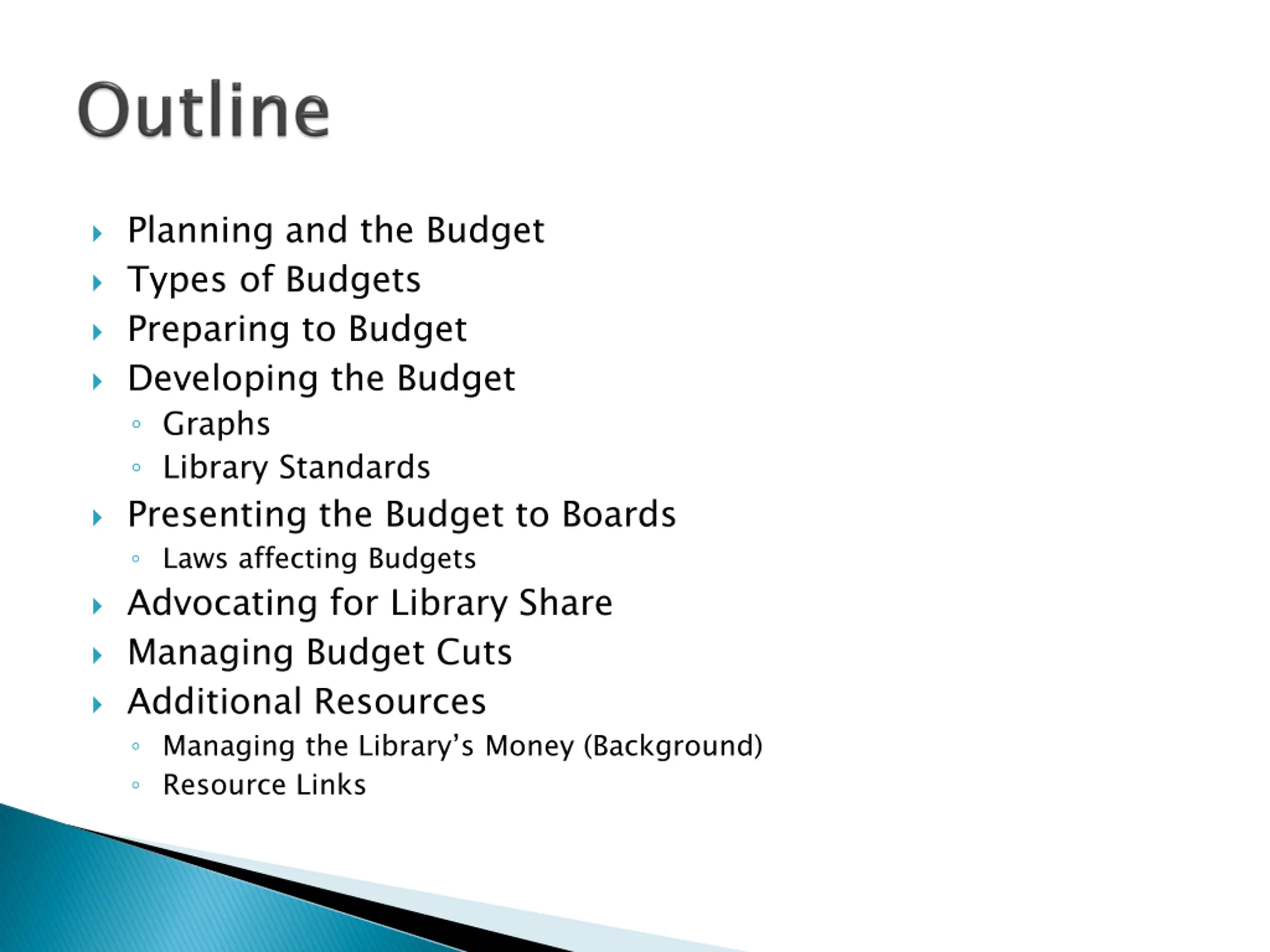 Planning and the Budget Types of Budgets Preparing to Budget Developing the Budget Graphs Library Standards Presenting the Budget to Boards Laws affecting Budgets Advocating for Library Share Managing Budget Cuts Additional Resources Managing the Library s Money (Background) Resource Links