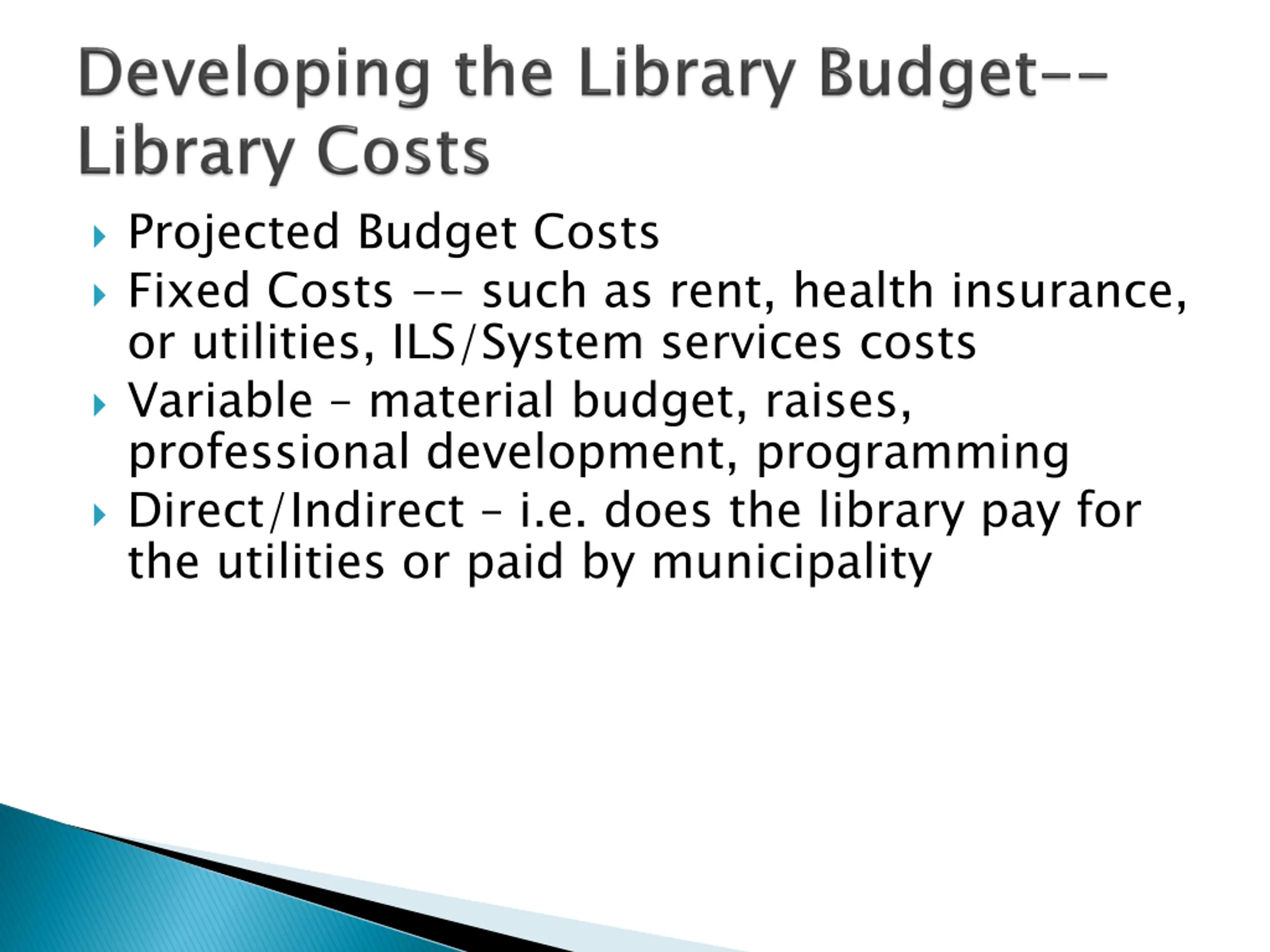 Projected Budget Costs Fixed Costs -- such as rent, health insurance, or utilities, ILS/System services costs Variable material budget, raises, professional development, programming Direct/Indirect i.e. does the library pay for the utilities or paid by municipality