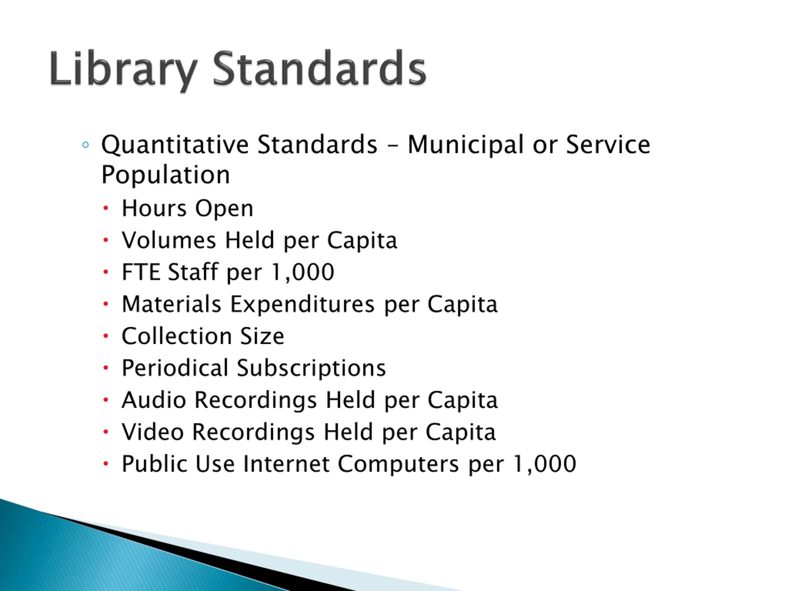 Quantitative Standards Municipal or Service Population Hours Open Volumes Held per Capita FTE Staff per 1,000 Materials Expenditures per Capita Collection Size Periodical Subscriptions Audio Recordings Held per Capita Video Recordings Held per Capita Public Use Internet Computers per 1,000