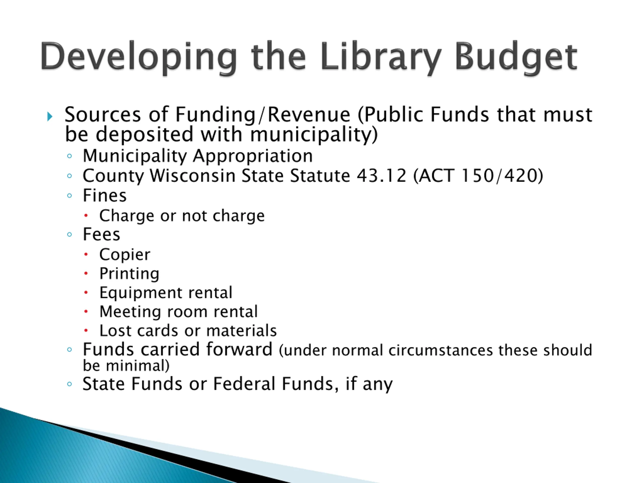 Sources of Funding/Revenue (Public Funds that must be deposited with municipality) Municipality Appropriation County Wisconsin State Statute 43.12 (ACT 150/420) Fines Charge or not charge Fees Copier Printing Equipment rental Meeting room rental Lost cards or materials Funds carried forward (under normal circumstances these should be minimal) State Funds or Federal Funds, if any