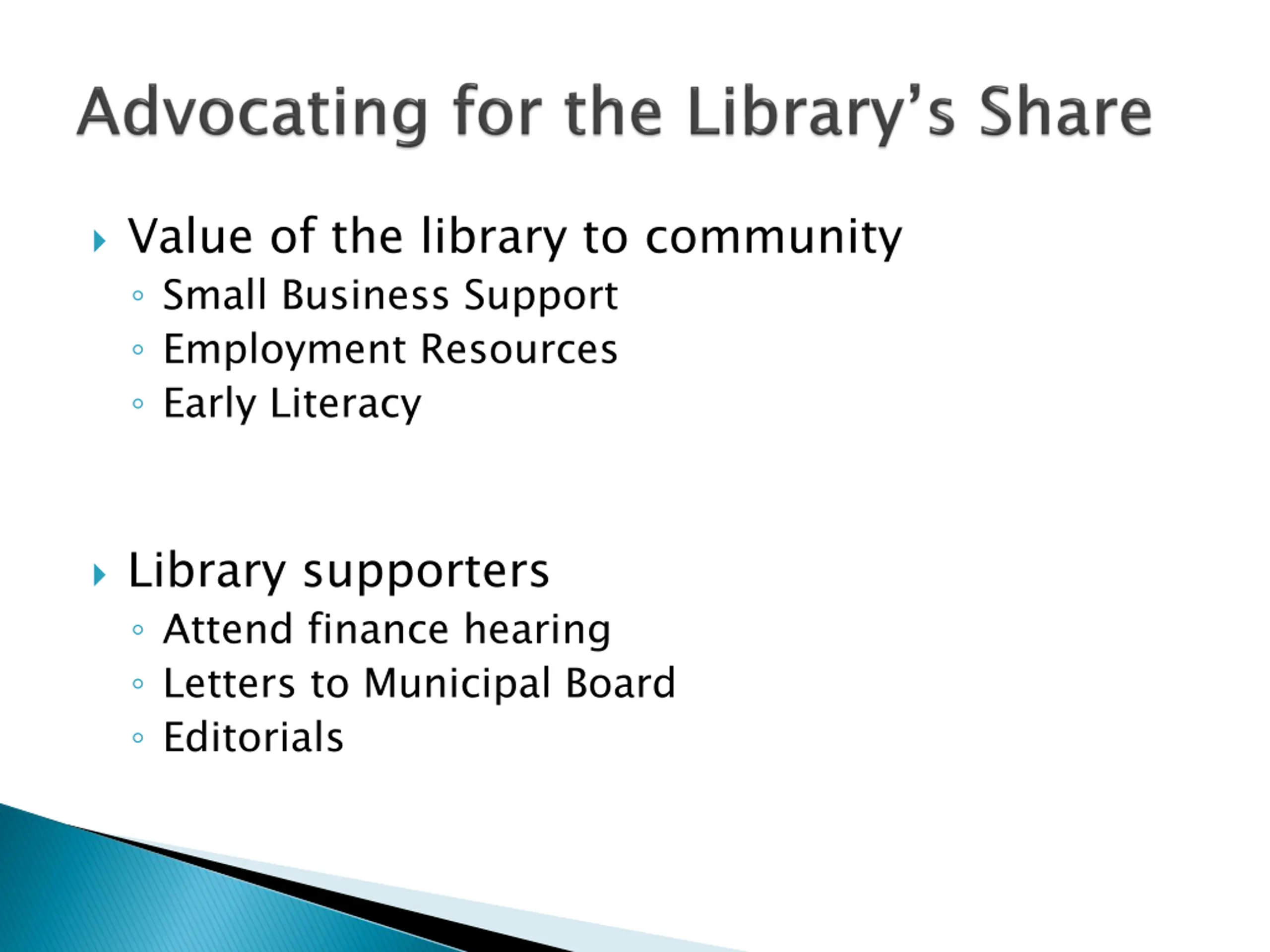 Value of the library to community Small Business Support Employment Resources Early Literacy Library supporters Attend finance hearing Letters to Municipal Board Editorials