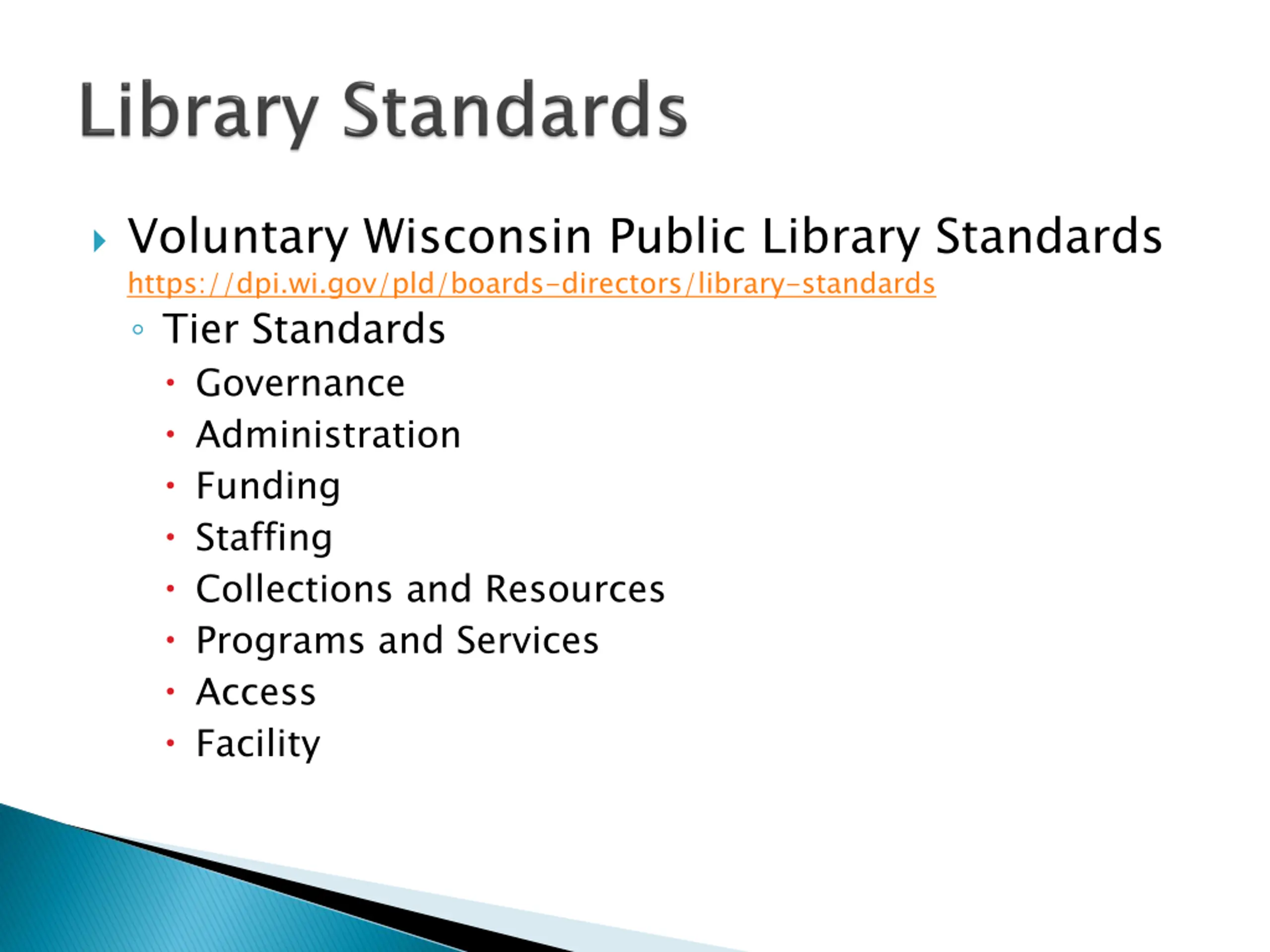 Voluntary Wisconsin Public Library Standards https://dpi.wi.gov/pld/boards-directors/library-standards Tier Standards Governance Administration Funding Staffing Collections and Resources Programs and Services Access Facility