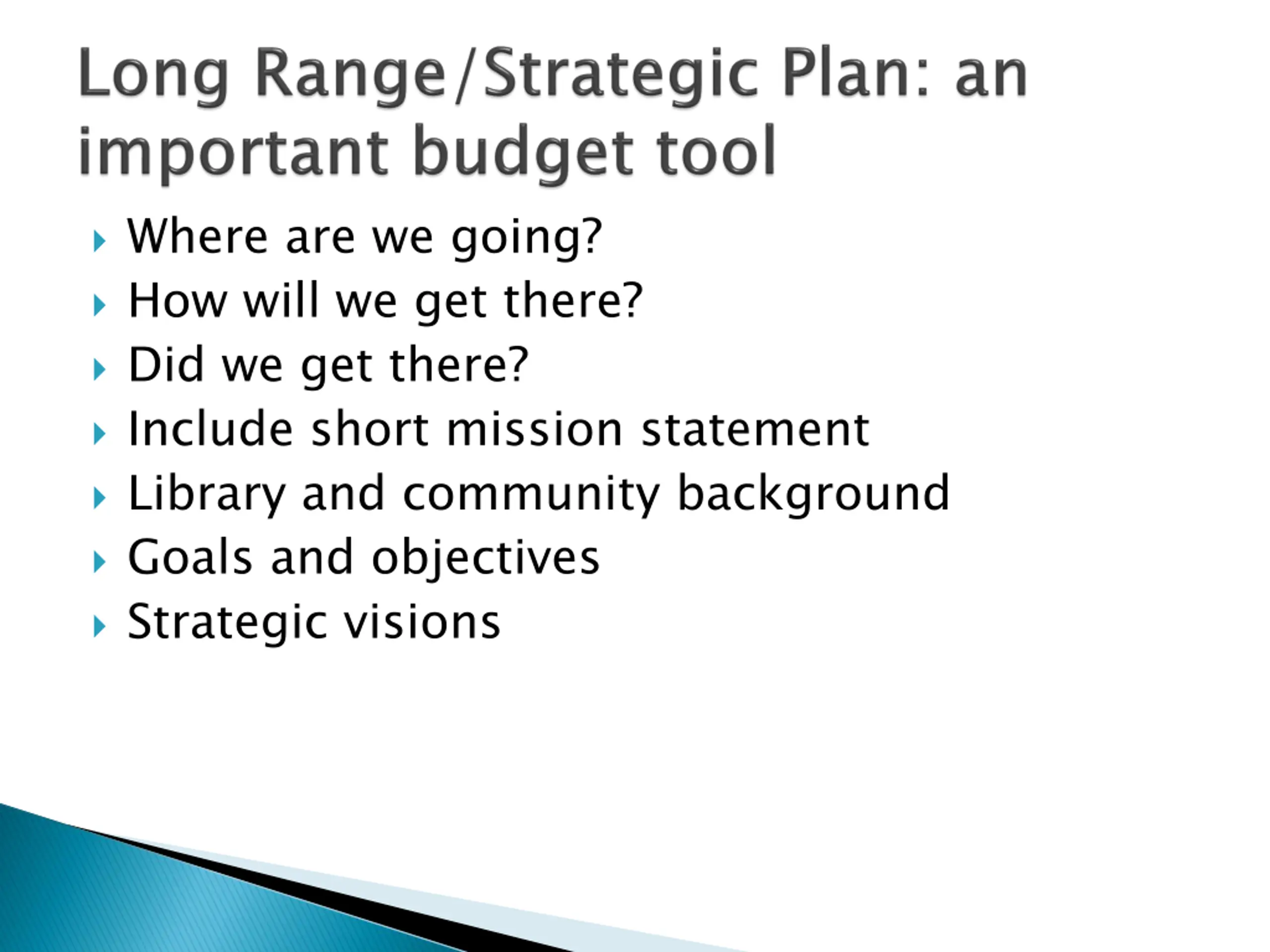 Where are we going? How will we get there? Did we get there? Include short mission statement Library and community background Goals and objectives Strategic visions
