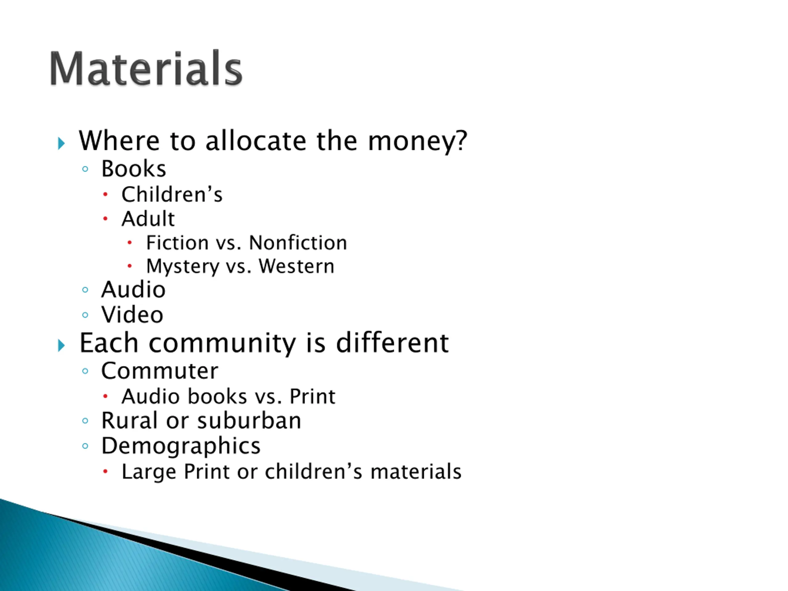 Where to allocate the money? Books Children s Adult Fiction vs. Nonfiction Mystery vs. Western Audio Video Each community is different Commuter Audio books vs. Print Rural or suburban Demographics Large Print or children s materials