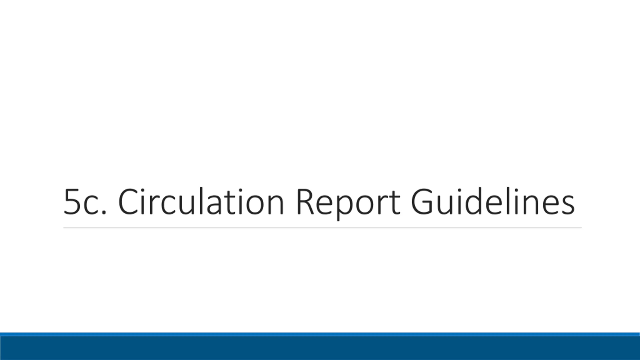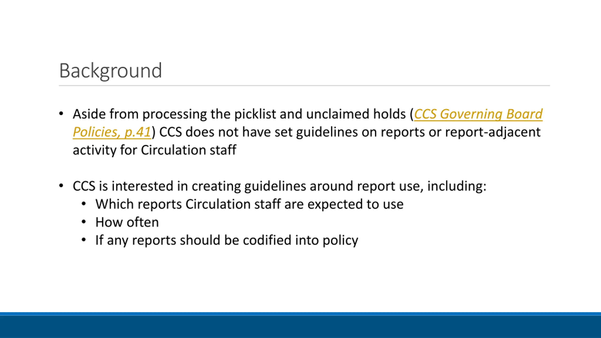 Background Aside from processing the picklist and unclaimed holds (CCS Governing Board Policies, p.41) CCS does not have set guidelines on reports or report-adjacent activity for Circulation staff CCS is interested in creating guidelines around report use, including: Which reports Circulation staff are expected to use How often If any reports should be codified into policy