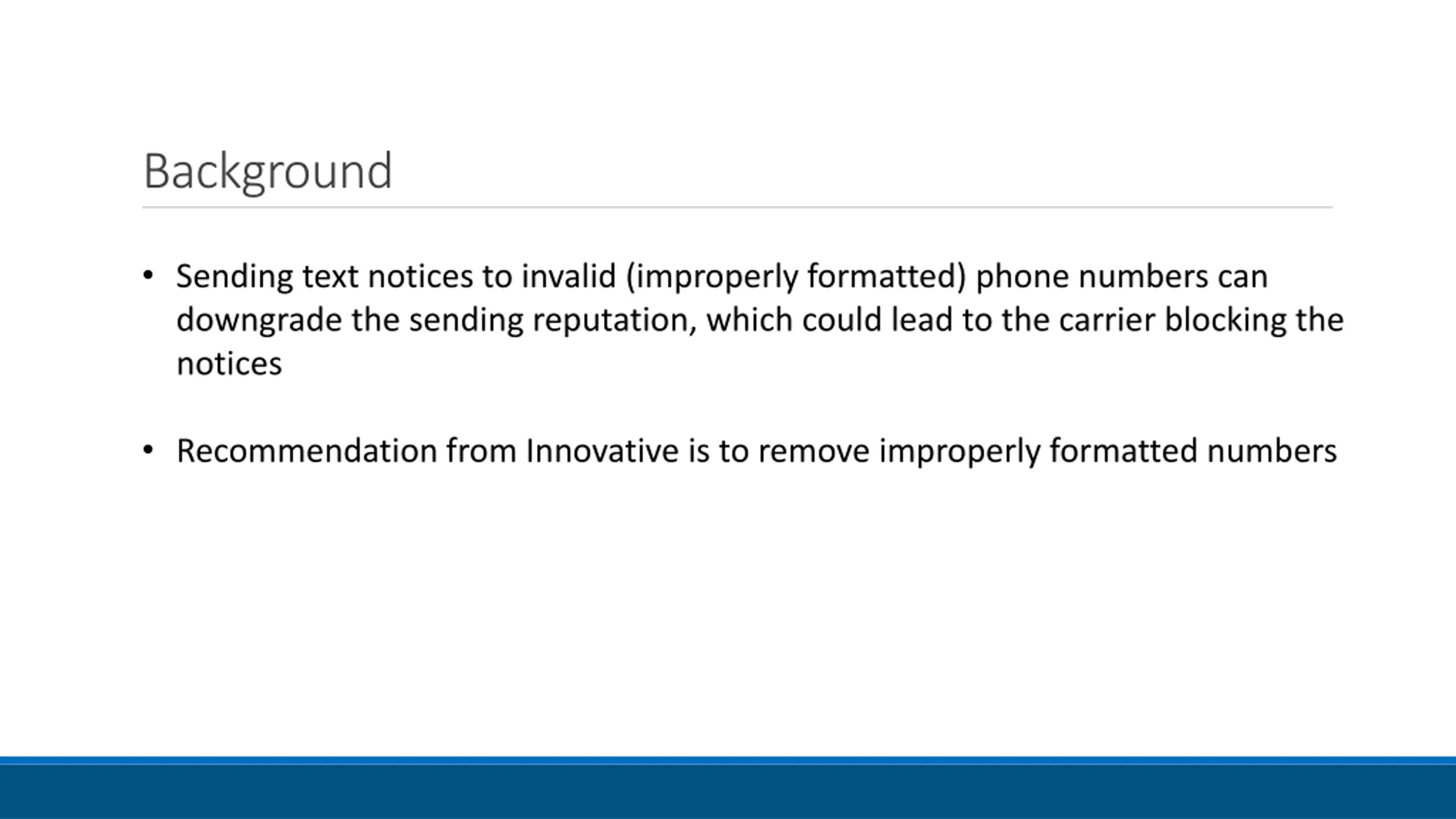 Background Sending text notices to invalid (improperly formatted) phone numbers can downgrade the sending reputation, which could lead to the carrier blocking the notices Recommendation from Innovative is to remove improperly formatted numbers