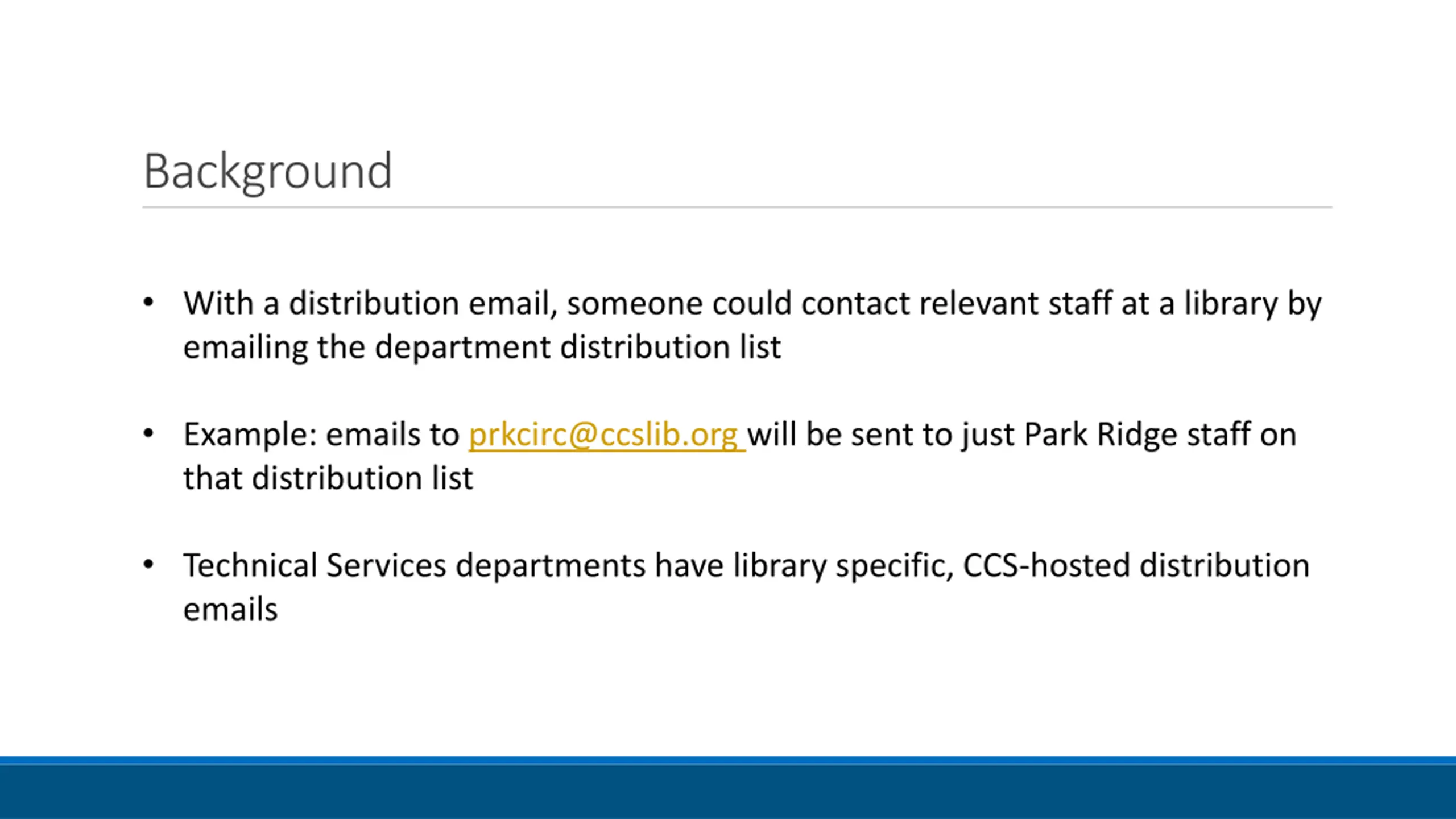 Background With a distribution email, someone could contact relevant staff at a library by emailing the department distribution list Example: emails to prkcirc@ccslib.org will be sent to just Park Ridge staff on that distribution list Technical Services departments have library specific, CCS-hosted distribution emails
