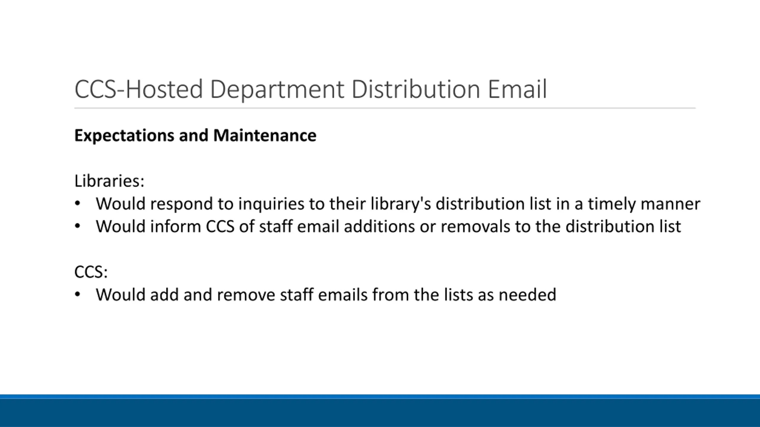 CCS-Hosted Department Distribution Email Expectations and Maintenance Libraries: Would respond to inquiries to their library's distribution list in a timely manner Would inform CCS of staff email additions or removals to the distribution list CCS: Would add and remove staff emails from the lists as needed