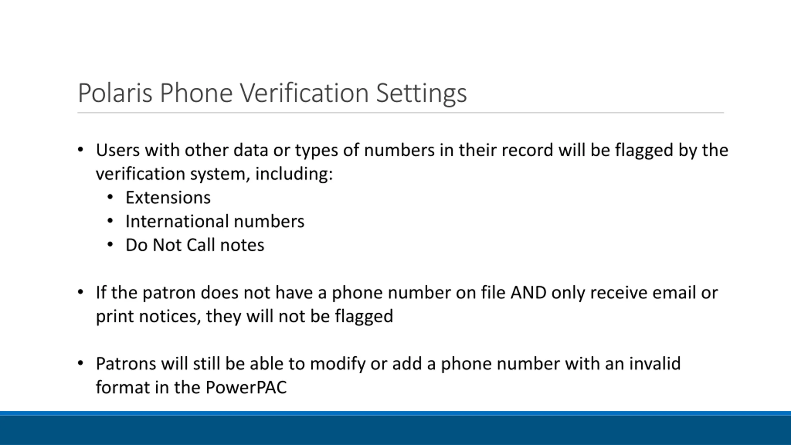 Polaris Phone Verification Settings Users with other data or types of numbers in their record will be flagged by the verification system, including: Extensions International numbers Do Not Call notes If the patron does not have a phone number on file AND only receive email or print notices, they will not be flagged Patrons will still be able to modify or add a phone number with an invalid format in the PowerPAC