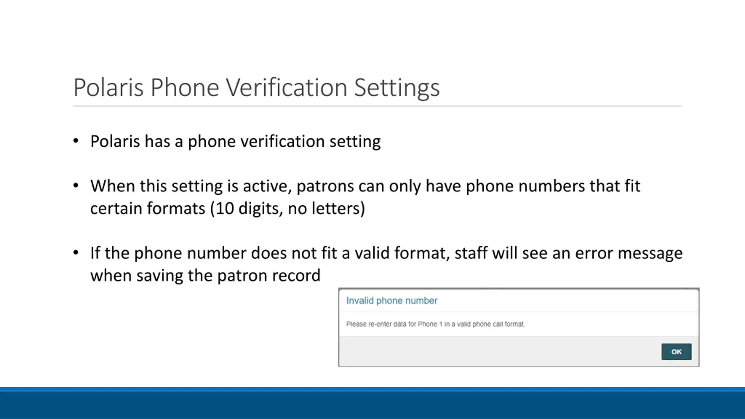Polaris Phone Verification Settings Polaris has a phone verification setting When this setting is active, patrons can only have phone numbers that fit certain formats (10 digits, no letters) If the phone number does not fit a valid format, staff will see an error message when saving the patron record