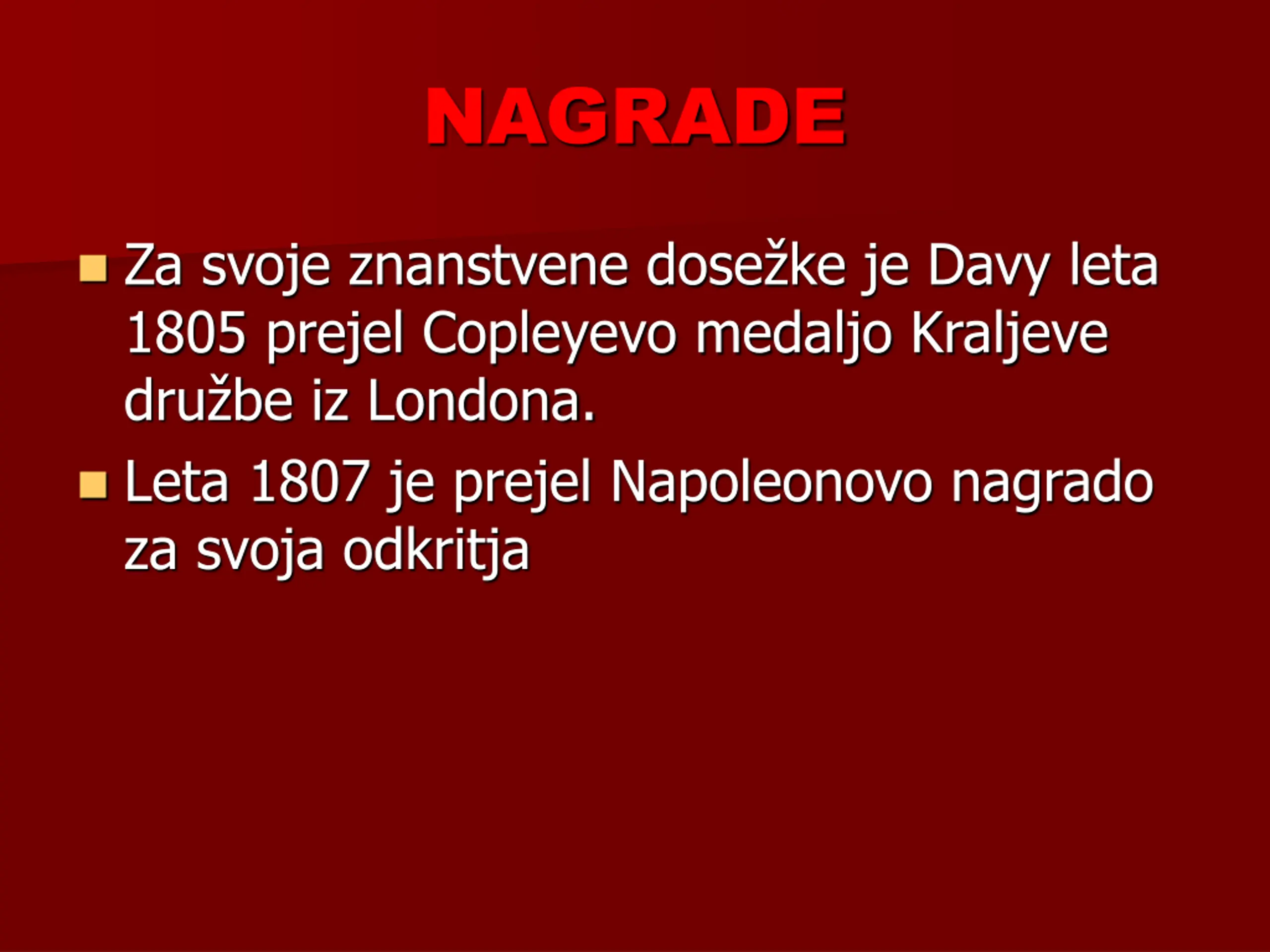 NAGRADE Za svoje znanstvene dose ke je Davy leta 1805 prejel Copleyevo medaljo Kraljeve dru be iz Londona. Leta 1807 je prejel Napoleonovo nagrado za svoja odkritja