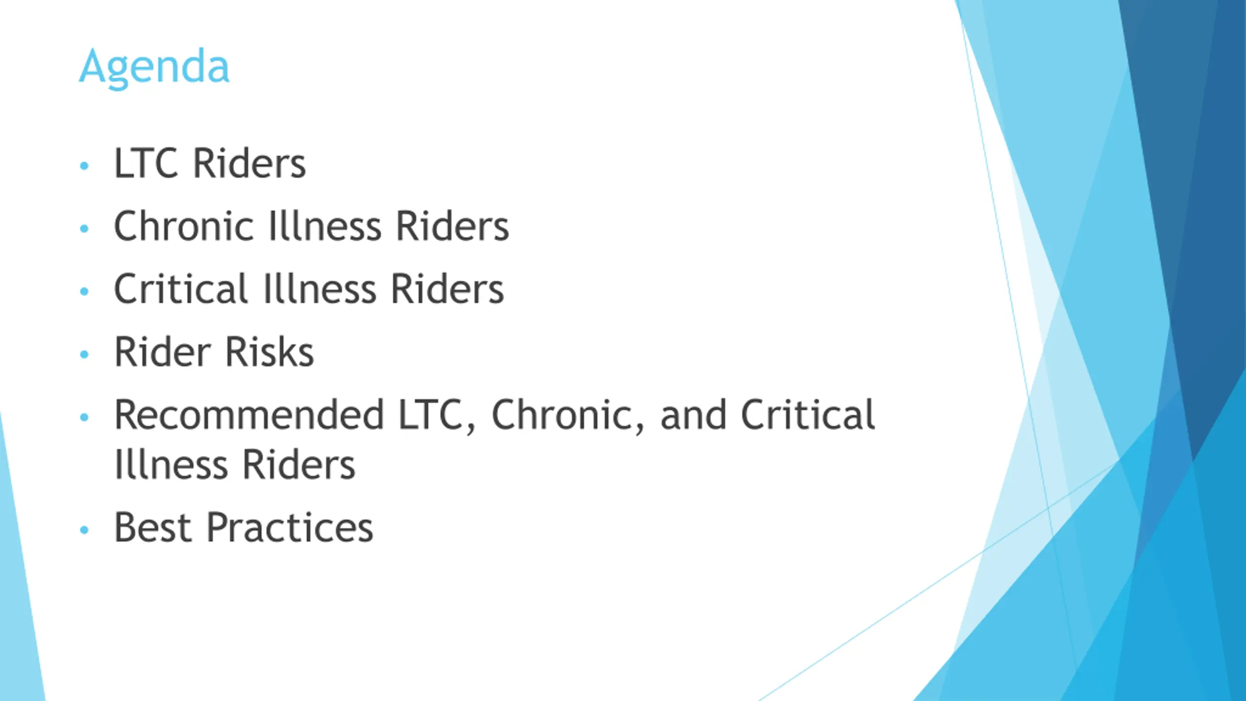 Agenda LTC Riders Chronic Illness Riders Critical Illness Riders Rider Risks Recommended LTC, Chronic, and Critical Illness Riders Best Practices